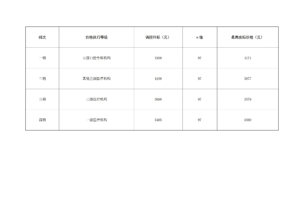 (二)单颗常规种植牙医疗服务全流程价格调控目标。济南市区内三级口腔专科公立医疗机构单颗常规种植牙价格(不含种植体、牙冠等可另收费耗材)调控目标为4300元,n值为97,实际价格不超过4171元。其他三级公立医疗机构单颗常规种植牙价格调控目标为4100元,n值为97,实际价格不超过3977元;二级公立医疗机构单颗常规种植牙价格调控目标为3690元,n值为97,实际价格不超过3579元;一级公立医疗机构单颗常规种植牙价格调控目标为3485元,n值为97,实际价格不超过3380元。详见附件3。