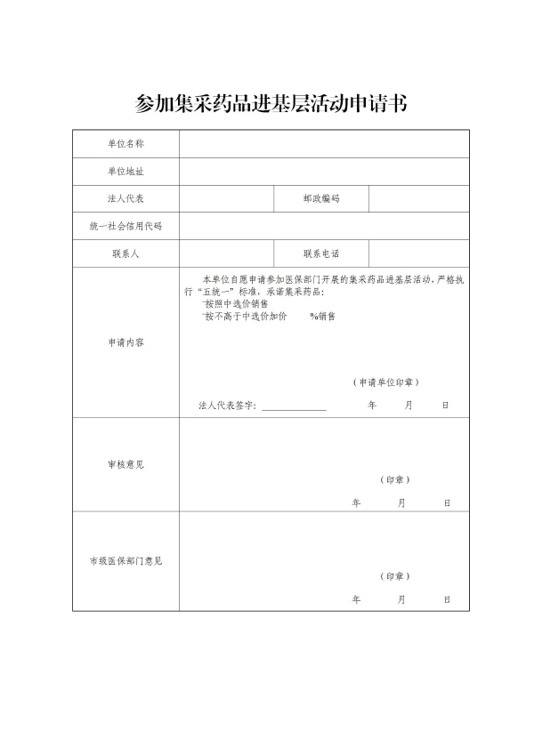(一)集采药品进药店。医保定点零售药店自愿参加,鼓励纳入我市门诊统筹管理的定点零售药店积极参加。参加单位在集采药品进基层活动品种范围名单中,自主遴选确定不少于50种药品,根据自身需求确定计划采购量,并通过省药械集中采购平台进行网上采购。7月27日前,由药品零售连锁总部或单体药店将计划采购量、《参加集采药品进基层活动申请书》(见附件2)和《承诺书》(见附件3)报送所属区县(含功能区,下同)医保部门。