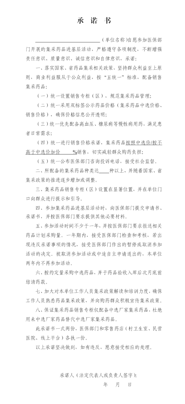 (四)统一进行销售价格承诺。参加集采药品进基层活动的单位,要严格履行《参加集采药品进基层活动申请书》《承诺书》中的承诺内容,对集采药品按照中选价或按不高于中选价加价一定比例销售,切实减轻群众购药负担。