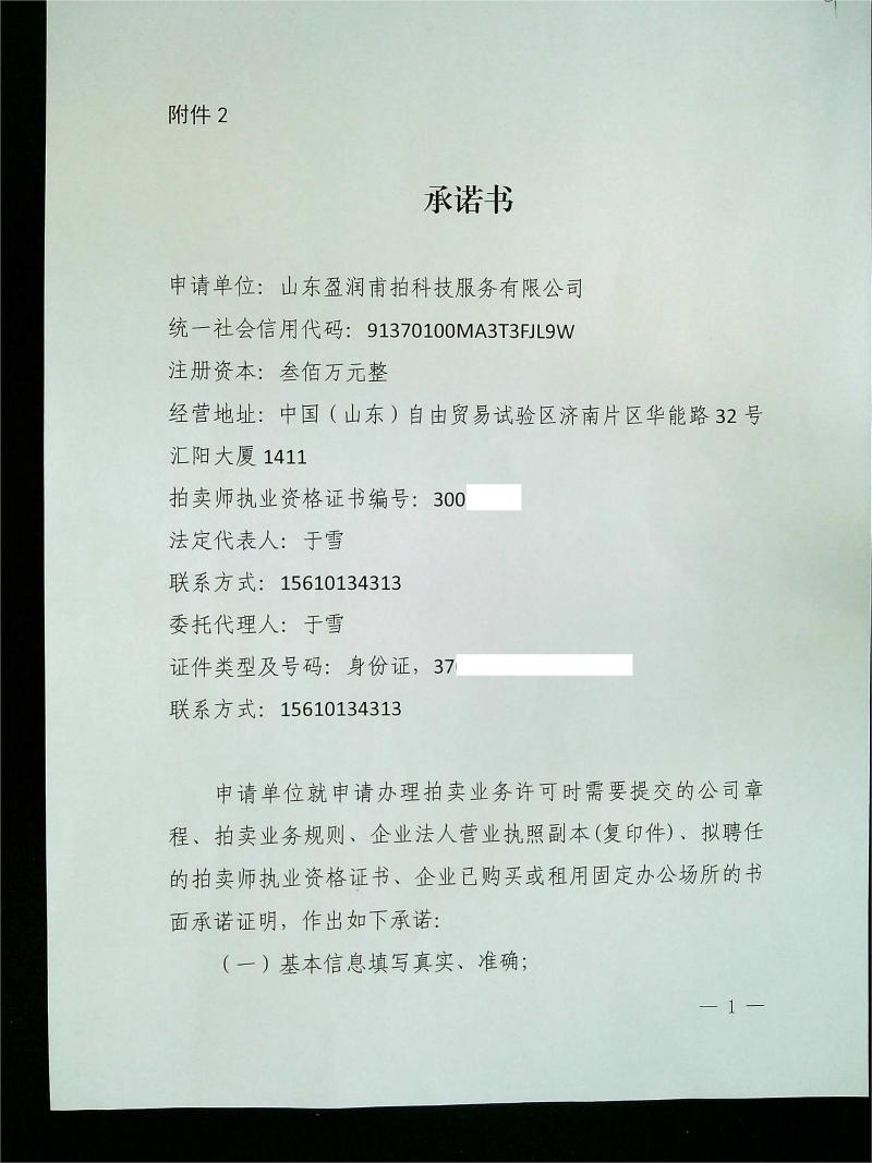 山东盈润甫拍科技服务有限公司申请拍卖业务许可的承诺书