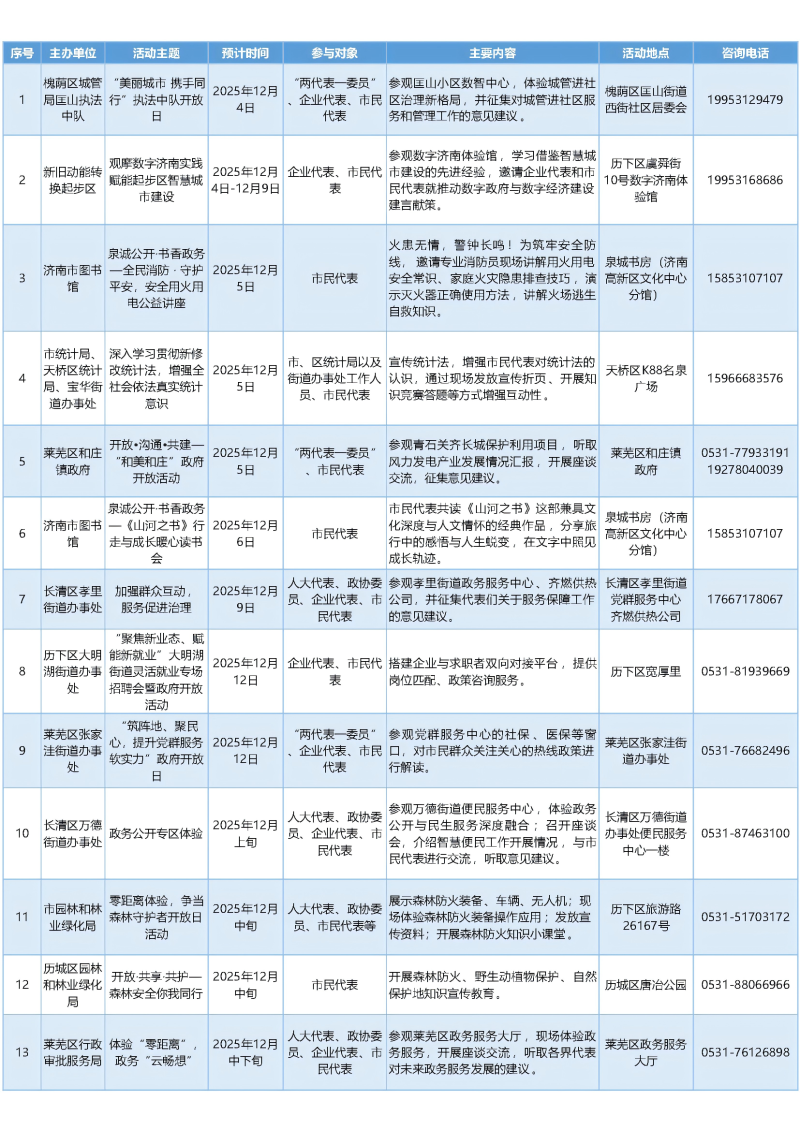 济南市2025年12月将举办“泉诚公开 政府开放”系列活动,涵盖城管执法、智慧城市建设、消防安全、统计法宣传、就业招聘、政务服务、森林安全等领域,欢迎您来参加。