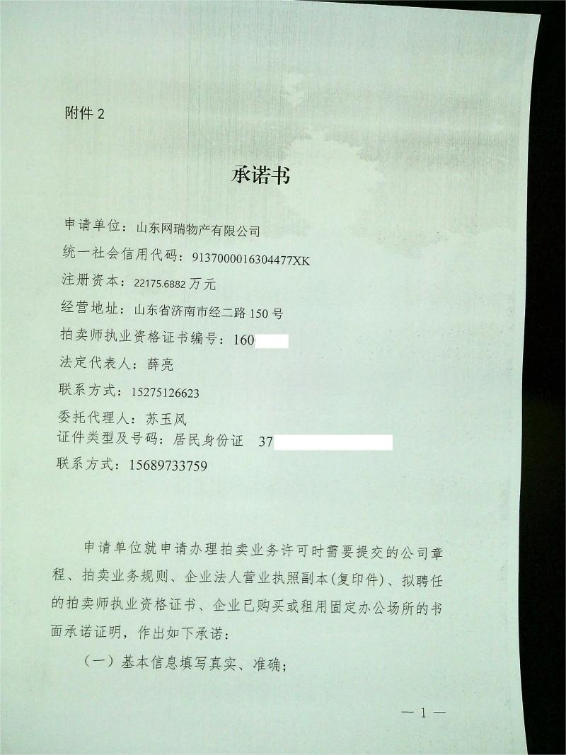 山东网瑞物产有限公司申请拍卖业务许可的承诺书
