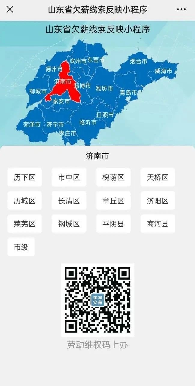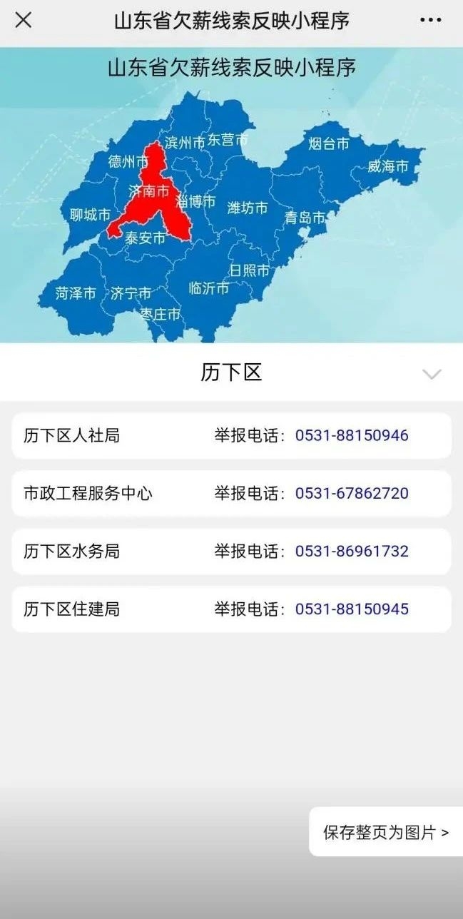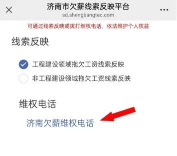 同时,在“欠薪投诉”维权入口,点击“济南欠薪维权电话”,可直接查看济南市各区县欠薪投诉电话,进行电话投诉。