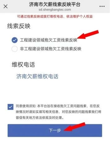 第二步:点击“欠薪投诉”按钮后,跳转至投诉页面,按照工程建设领域或非工程建设领域勾选,填写并提交维权诉求信息。