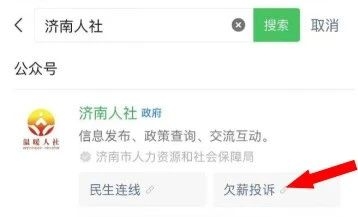 第一步:打开微信,搜索并关注“济南人社”公众号,点击“欠薪投诉”按钮,即可进入维权入口