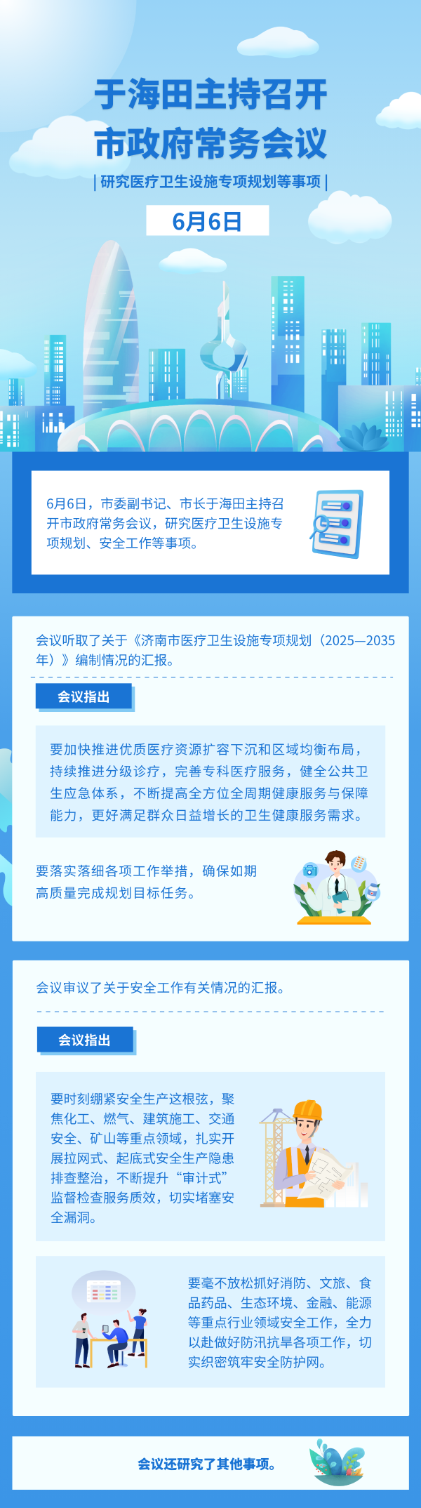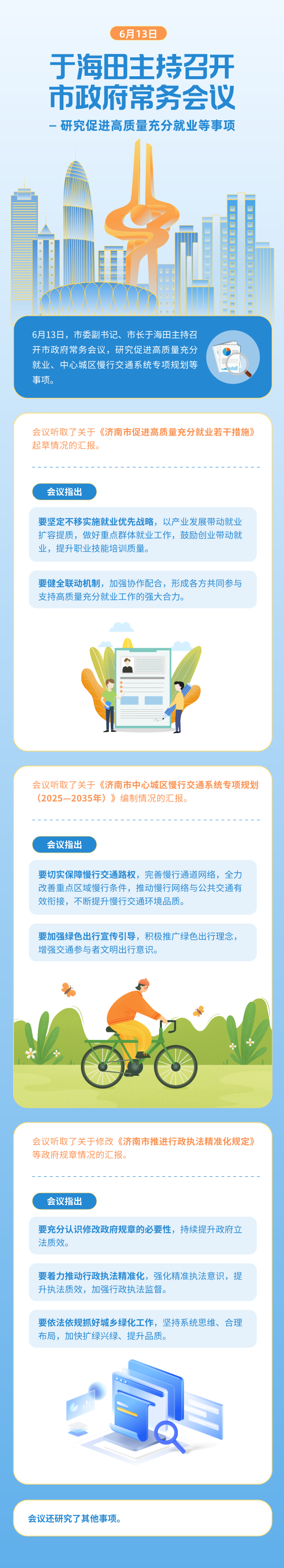 6月13日,市委副书记、市长于海田主持召开市政府常务会议,研究促进高质量充分就业、中心城区慢行交通系统专项规划等事项。