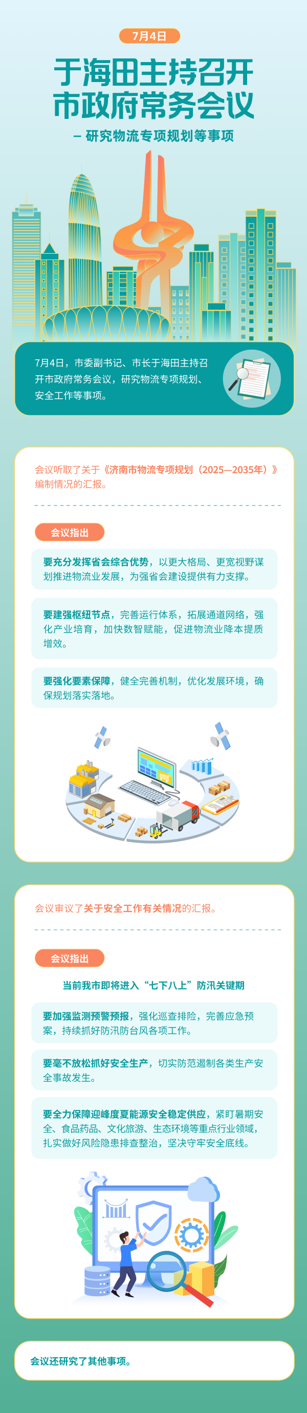 7月4日,市委副书记、市长于海田主持召开市政府常务会议,研究物流专项规划、安全工作等事项。