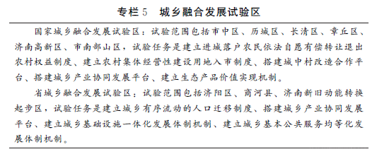 (二)搭建城乡产业协同发展平台。立足特色小镇和小城镇优势条件,着力发展特色产业,积极培育产业集群。鼓励镇村利用集体经营性建设用地,探索建设高标准产业发展设施。加快打造章丘三涧溪冷链仓储物流平台、济南新旧动能转换起步区太平科技农业生态农业基地等重点平台,促进城乡产业实现“平台内小融合、多平台大融合”。提高农业园区建设水平,探索实施“园区+平台公司”模式,促进乡村多产业、多业态融合发展。打造城乡融合发展试验先行区,支持区县创新探索体制机制,推动城乡生产要素跨界流动和高效配置,贯通城乡产业融合发展全链条。