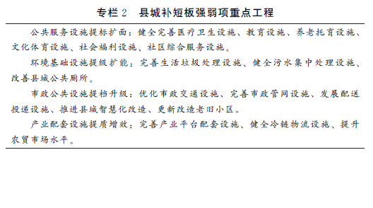 (一)强化重点领域设施建设。按照县城建设客观规律,以需求为导向,加快公共服务设施提标扩面、环境卫生设施提级扩能、市政公用设施提档升级、产业培育设施提质增效。加强公益性、准公益性项目谋划,推动公益性、准公益性与其他有经济效益的建设内容合理搭配,策划一批现金流健康的经营性项目,做实县城城镇化补短板强弱项项目库,制定用地、资金等支持计划和解决方案。加大财政性资金支持力度,创新资金投入方式与运营模式,调动金融资本和工商资本投入积极性。规范有序推进政府和社会资本合作(PPP)模式,积极试点基础设施领域不动产投资信托基金(REITs)。
