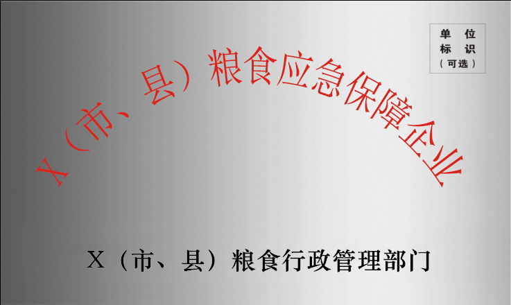 说明:1.牌匾大小规格为600*400*25mm,材质为1mm厚不锈钢,面拉丝处理。2.“X(市、县)粮食行政管理部门”字体如上,颜色为黑色;“X(市、县)粮食应急保障企业”字体如上,颜色为红色。3.落款为授权的粮食行政管理部门。4.授牌对象为非企业性质的社会主体,授予名称为“X(市、县)粮食应急保障网点”。5.是否放置单位标识,以及颜色、大小,可自行决定。