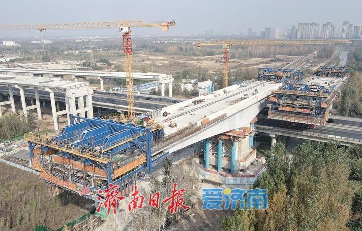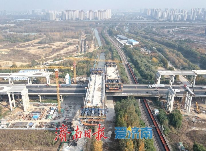 11月6日,在京台高速公路齐河至济南段改扩建工程项目小清河吴家堡段,跨京沪三、四号线两座涉铁转体桥主体浇筑已初具规模,完成后将通过旋转与南北两侧在建高架路段实现对接。