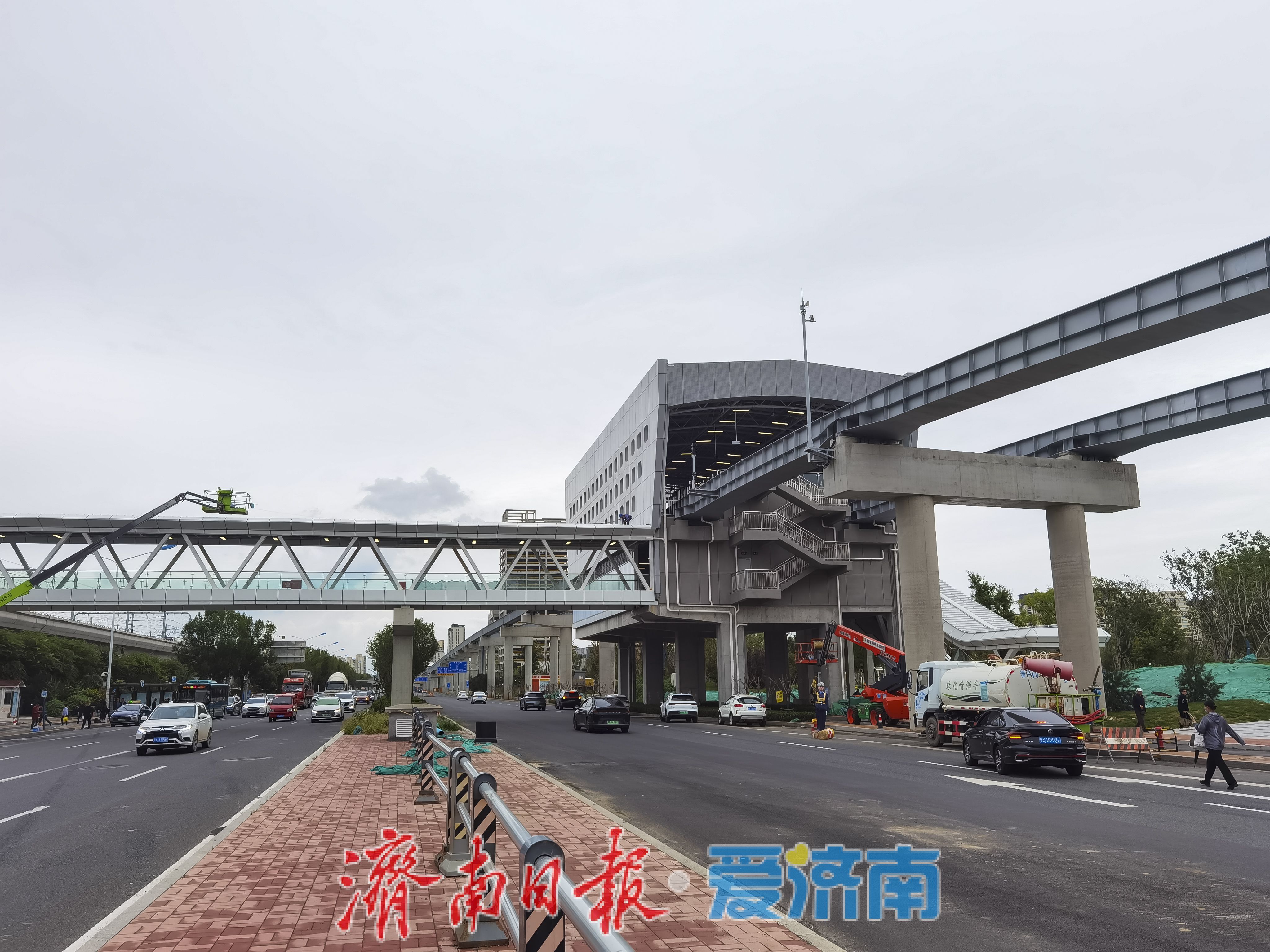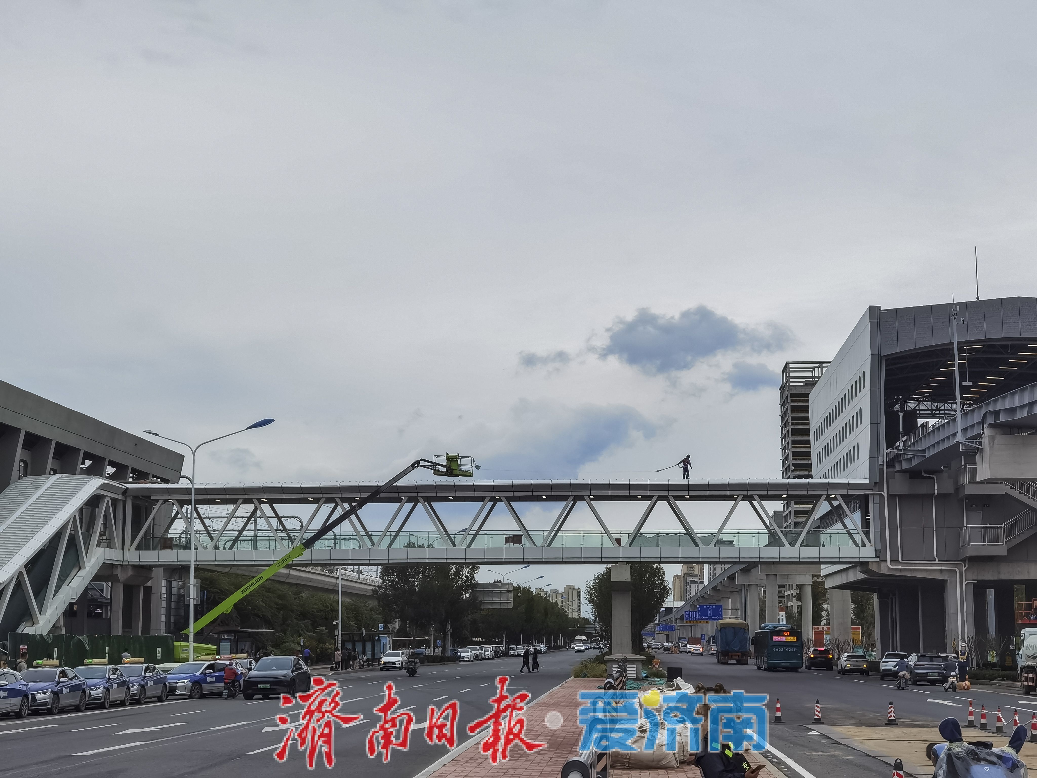 近日,在济南轨道交通2号线彭家庄站,一座横跨飞跃大道的人行天桥主体结构已完工,目前工程进入最后收尾阶段。