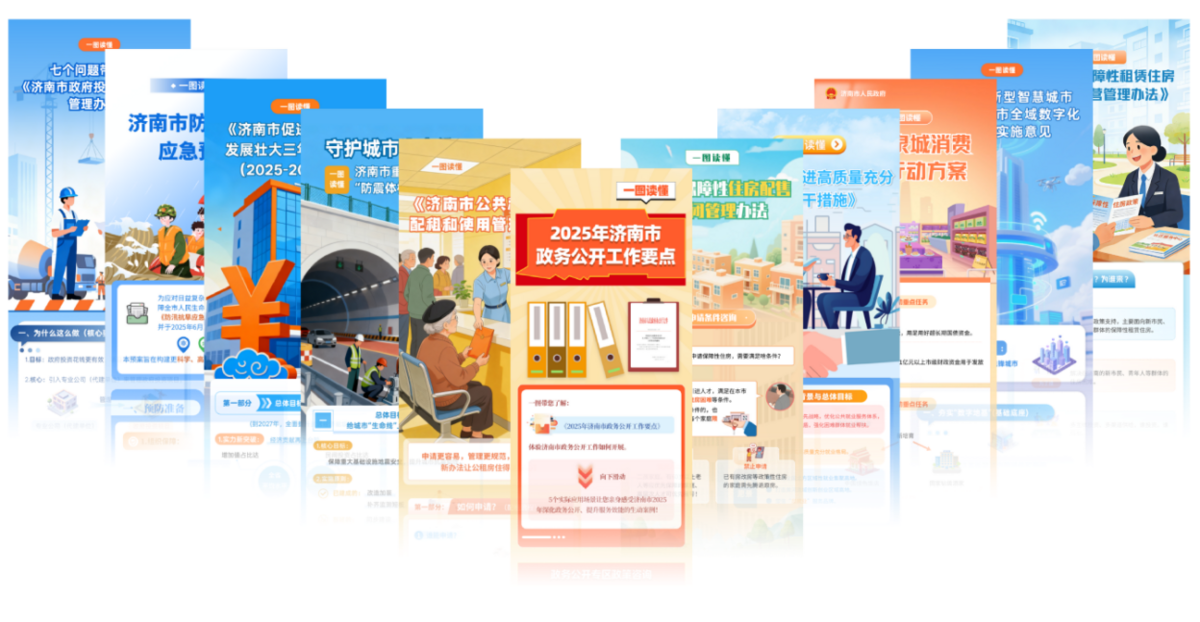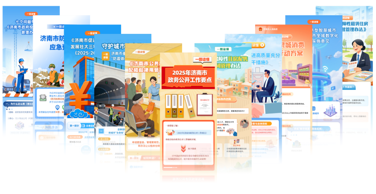 (一)主动公开。聚焦便民惠企、营商环境、民生保障等重点领域,主动公开政策文件、办事服务等信息。综合运用图文、视频、H5、动漫等形式,将“政策语言”转化为有温度的“民生故事”,全年发布政策解读信息598条,政策知晓度和覆盖面显著提高。2025年通过市政府网站发布信息9428条,回应公众关注热点或重大舆情151次,办结网民留言24344条,开展意见征集16期。通过“济南政务微信号”“微博济南”“济南政务头条号”市级政务新媒体账号,全年发布信息6331条,累计阅读量3748万,总粉丝数192万。