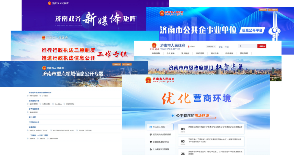 (四)平台建设。持续提升政府网站和政务新媒体集约化建设水平,不断优化网站栏目设置及功能。扎实做好政务新媒体“瘦身提质”工作,做优做强“济南公安”“济南人社”等一批群众关注度高、影响力大的精品账号。全年编辑出版《济南市人民政府公报》24期,进一步扩大网络版公报覆盖面和查阅便利度。持续优化各级政务公开专区建设,进一步提升专区利用率、知晓度和为民服务质效,将其打造为政策咨询、信息查阅、民意收集的重要阵地。