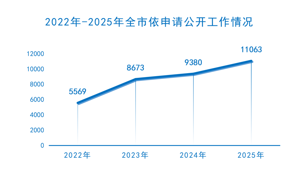 (二)依申请公开。健全完善全市依申请公开办理平台,省、市平台实现互联互通与数据共享,依申请公开办理质效全面提升。强化业务统筹和案例指导,定期组织开展联合会商,研究处置疑难、复杂申请。开展依申请公开暗访,编制依申请公开服务效能评估分析报告,有针对性制定改进措施。2025年新收到政府信息公开申请11228件,2024年结转至2025年办理276件,共计11504件;按规定结转至2026年继续办理441件,2025年共依法办结11063件。从申请内容看,主要涉及城市更新、征收拆迁、土地出让等方面,共办理政府信息公开行政复议484件,行政诉讼221件。