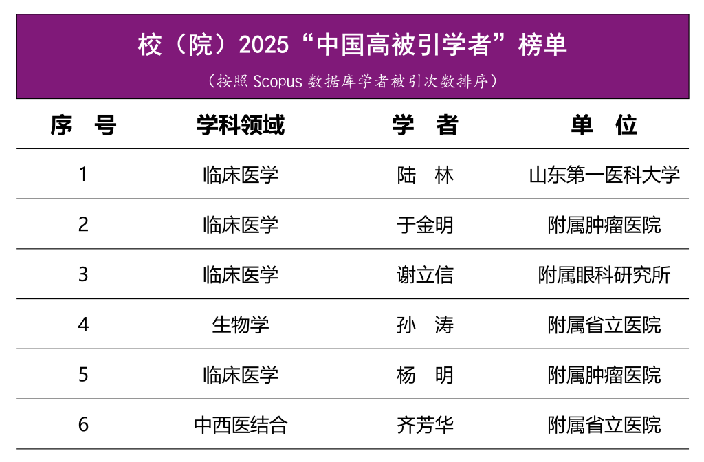 山东第一医科大学6位学者入选2025“中国高被引学者”榜单