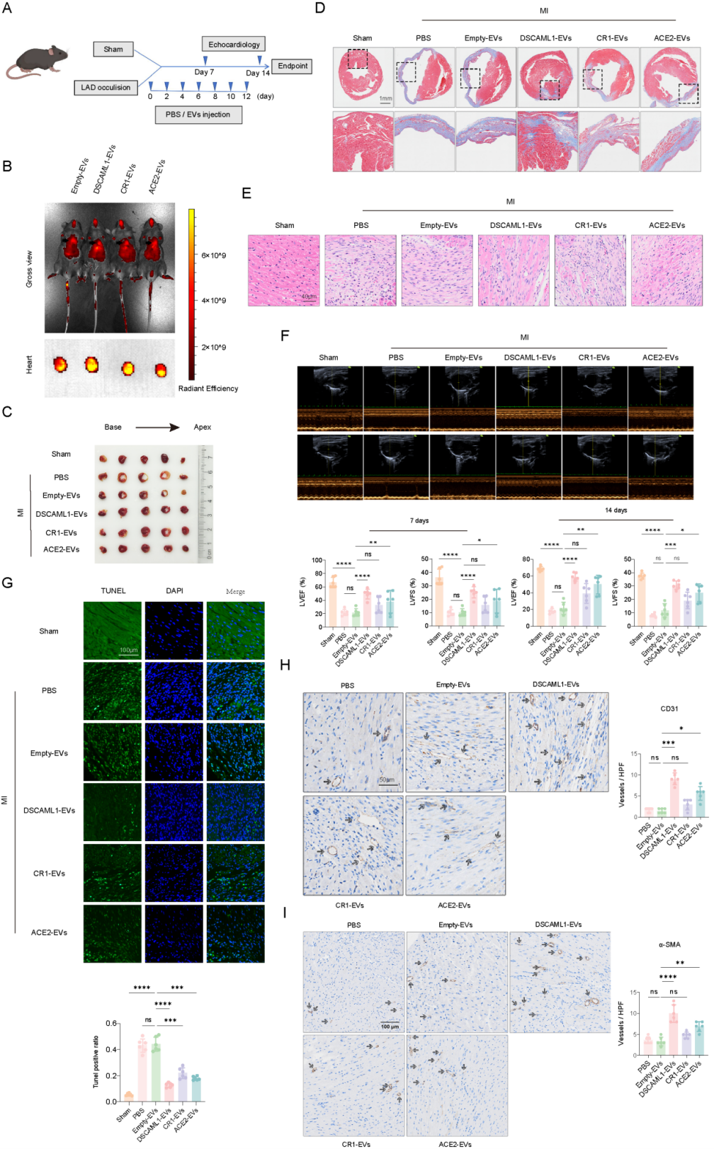 为研究DSCAML1-EVs、CR1-EVs和ACE2-EVs亚群对梗死后心脏修复的体内效应,作者通过结扎左前降支冠状动脉建立了小鼠心肌梗死(MI)模型。静脉注射后EVs后可到达心脏,并观察到EVs积聚在MI区域,被内皮细胞和心肌细胞摄取。组织学分析发现DSCAML1-EVs注射可显著减少心肌纤维化和梗死面积。此外,DSCAML1-EVs干预还可减轻了梗死后心肌中的炎症细胞浸润、减轻心肌细胞凋亡、促进梗死周围区域的血管新生。超声心动图进一步显示,DSCAML1-EVs组的心脏收缩和舒张功能均显著改善。这些研究结果表明,DSCAML1-EVs能够通过抑制细胞凋亡、减轻炎症和促进血管生成来改善MI后的心脏修复,从而有助于心功能的恢复。