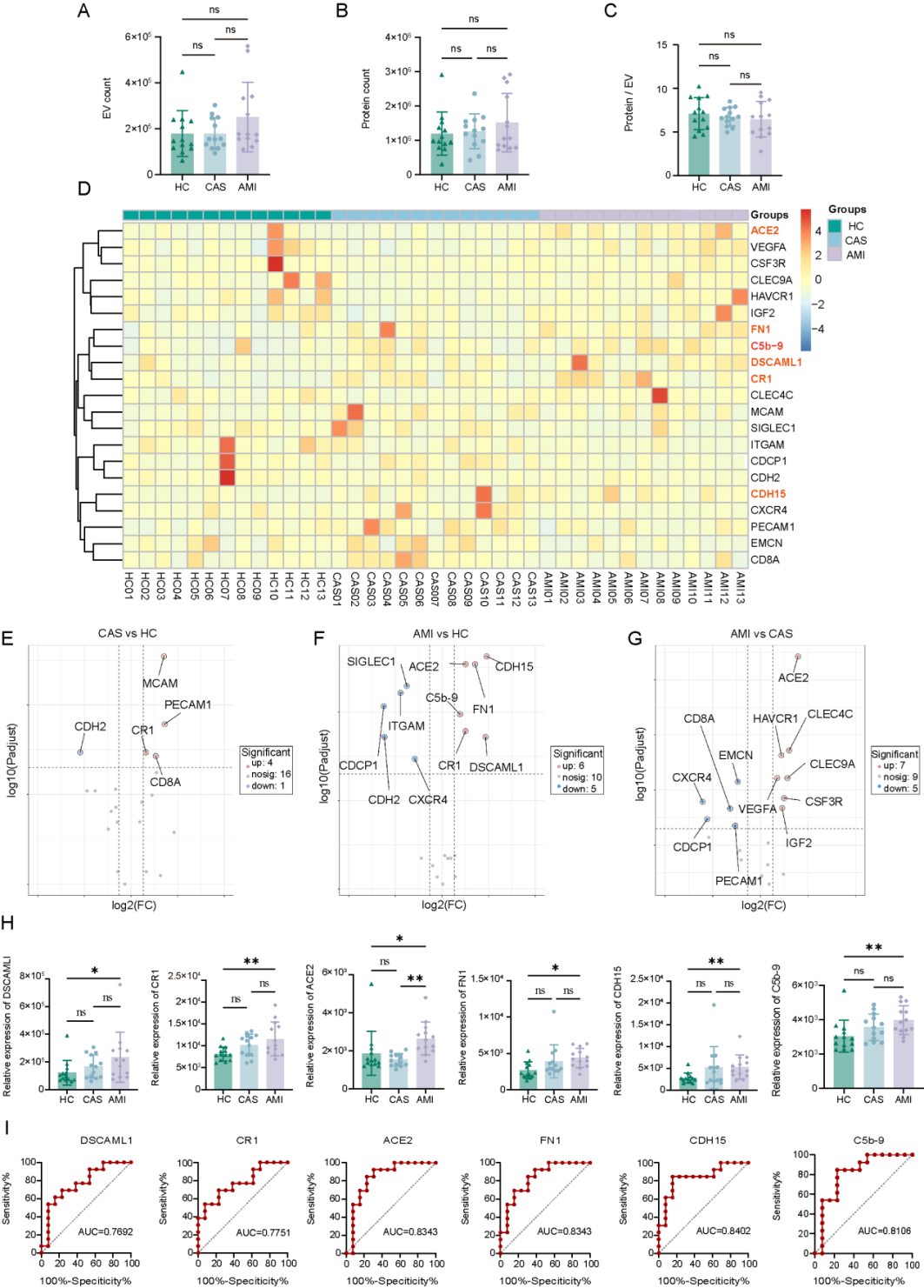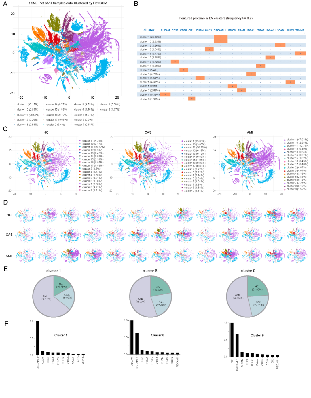 研究通过对EVs亚群进行聚类分析共鉴定出17个不同的EV亚群,每个亚群有自己独特的蛋白分子特征。在所有鉴定出的亚群中,Cluster1在总EVs中占比最大,达到36.12%,并且其EVs来源比例从HC组的16.75%逐步增加到CAS组的19.08%,再增至AMI组的64.18%。Cluster1的特征是每个EV普遍存在DSCAML1,而Cluster8和Cluster9则分别以每个EV均普遍表达ALCAM和CR1为特征。综上所述,Cluster1、8和9被鉴定为与AMI相关的亚群,其特点是在HC、CAS和AMI各组中的分布差异明显,且在AMI样本中占比最高。