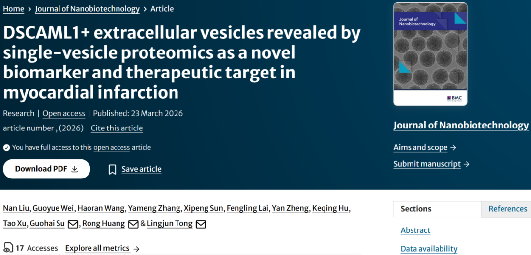 DSCAML1+extracellular vesicles revealed by single-vesicle proteomics as a novel biomarker and therapeutic target in myocardial infarction. J Nanobiotechnology, 2026. doi: 10.1186/s12951-026-04307-3.