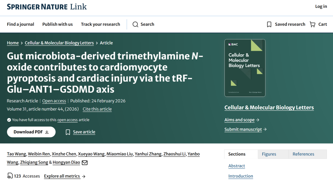 近日,济南微生态生物医学省实验室刁宏燕教授、王涛助理研究员团队在《Cellular & Molecular Biology Letters》期刊在线发表题为“Gut microbiota-derived trimethylamine N-oxide contributes to cardiomyocyte pyroptosis and cardiac injury via the tRF-Glu-ANT1-GSDMD axis”的研究论文。该研究揭示了菌群代谢物激活tRF-Glu-ANT1-GSDMD信号轴的调节机制在细胞炎症性死亡的关键作用,为开发针对菌群靶向治疗策略提供新的视角。济南微生态生物医学省实验室为该论文第一完成单位。