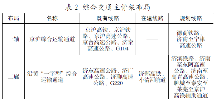 1.“一轴”。京沪综合运输通道是《国家综合立体交通网规划纲要》确定的“京津冀—长三角主轴路径2”的重要组成部分,是济南北向连接京津冀,南向连接长三角乃至连通全球的主廊道。要推动济南至宁津高速公路、京台高速公路改扩建等重点项目建设,跟踪关注京沪新技术展望铁路规划研究情况,预留通道,进一步完善通道设施供给。