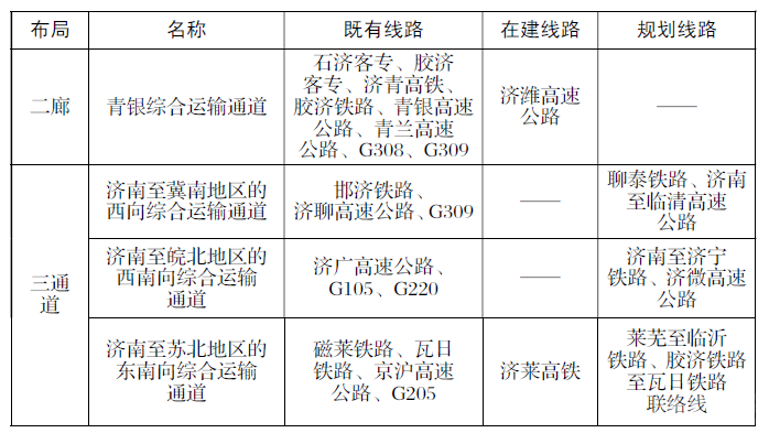 3.“三通道”。济南至冀南地区的西向综合运输通道是济南西向带动聊城、德州,进而联动邢台、邯郸、长治等内陆腹地的关键通道,要加快推进聊泰铁路、济南至临清高速公路等项目的规划建设,积极发挥黄河流域中心城市功能。济南至皖北地区的西南向综合运输通道是济南西南向连接济宁、菏泽,进而联动商丘、徐州、淮北等地的关键通道,要推动济南至济宁铁路、济微高速公路等项目规划建设,着力提升省会经济圈与鲁南经济圈、皖北地区的联动水平。济南至苏北地区的东南向综合运输通道是济南带动临沂等鲁南经济圈东部区域,进而衔接连云港等江苏沿海城市的关键通道,也是济南融入京沪辅助通道衔接长三角的重要支撑。要推动济莱高铁、胶济铁路至瓦日铁路联络线等项目规划建设,切实提升枢纽辐射能力。