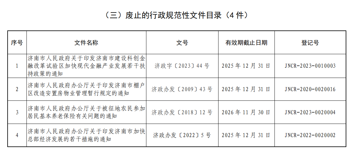 三、对《济南市人民政府关于印发济南市建设科创金融改革试验区加快现代金融产业发展若干扶持政策的通知》(济政字〔2023〕44号)等4件文件予以废止。