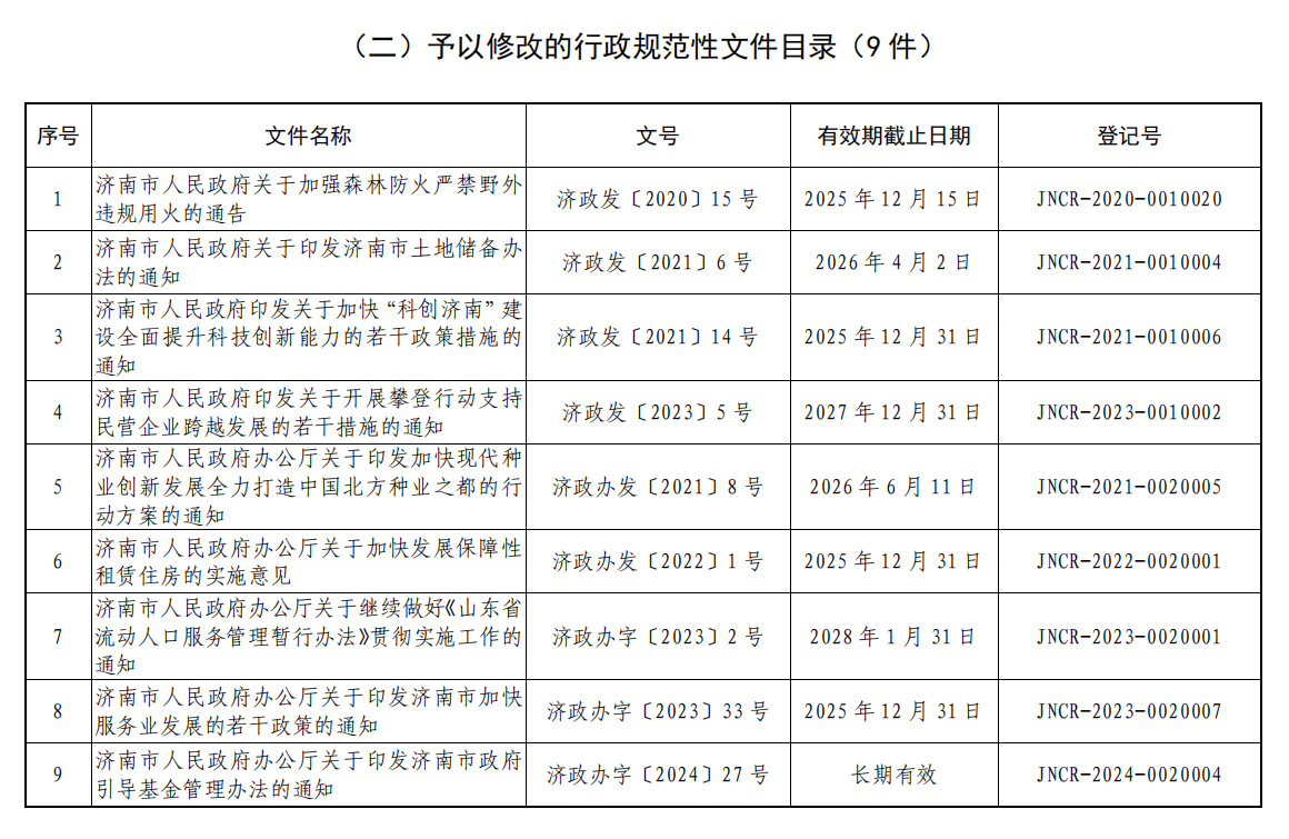 二、对《济南市人民政府关于加强森林防火严禁野外违规用火的通告》(济政发〔2020〕15号)等9件文件予以修改。