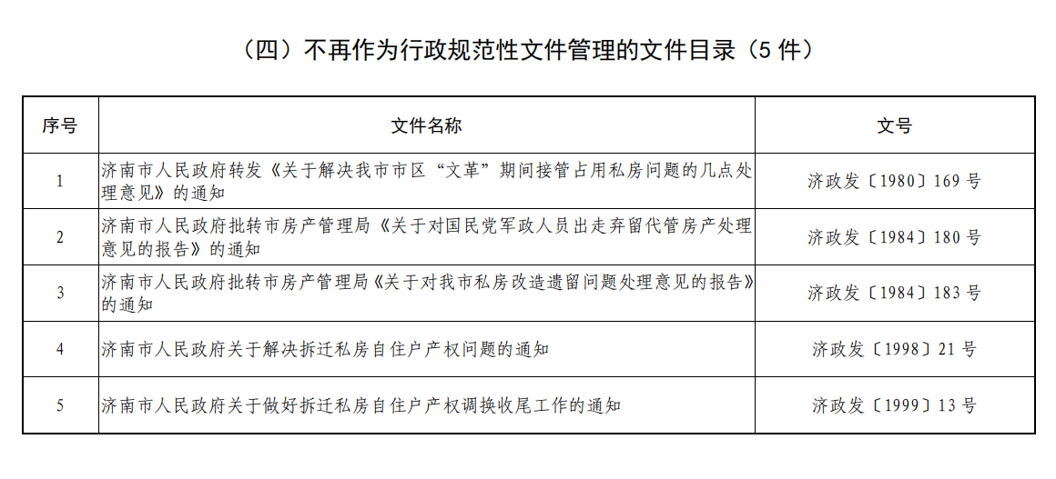 四、《济南市人民政府转发〈关于解决我市市区“文革”期间接管占用私房问题的几点处理意见〉的通知》(济政发〔1980〕169号)等5件文件不再作为行政规范性文件管理。
