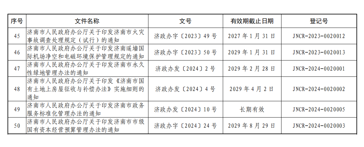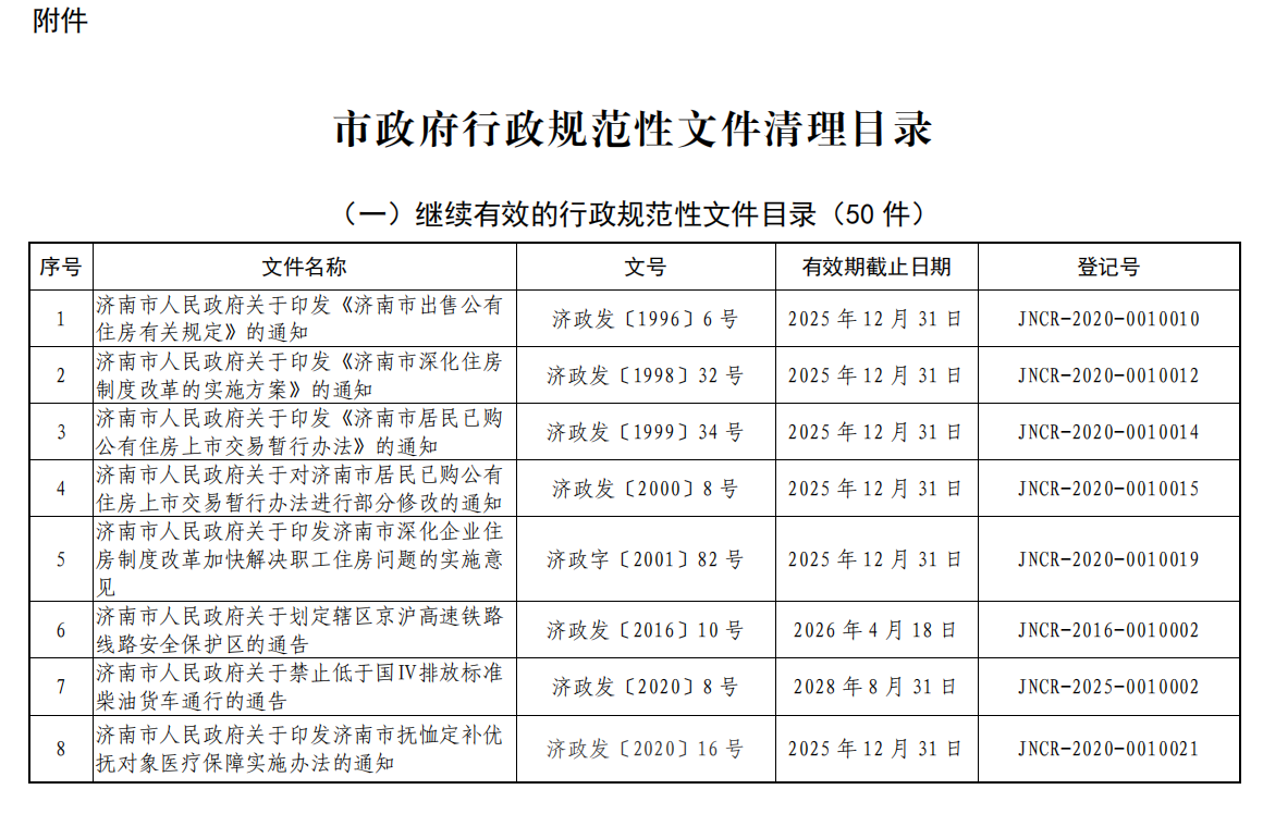 一、《济南市人民政府关于印发〈济南市出售公有住房有关规定〉的通知》(济政发〔1996〕6号)等50件文件继续有效。