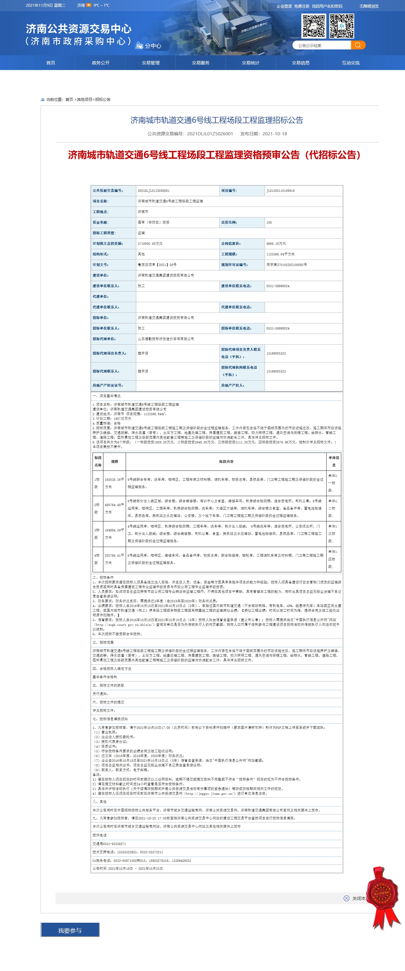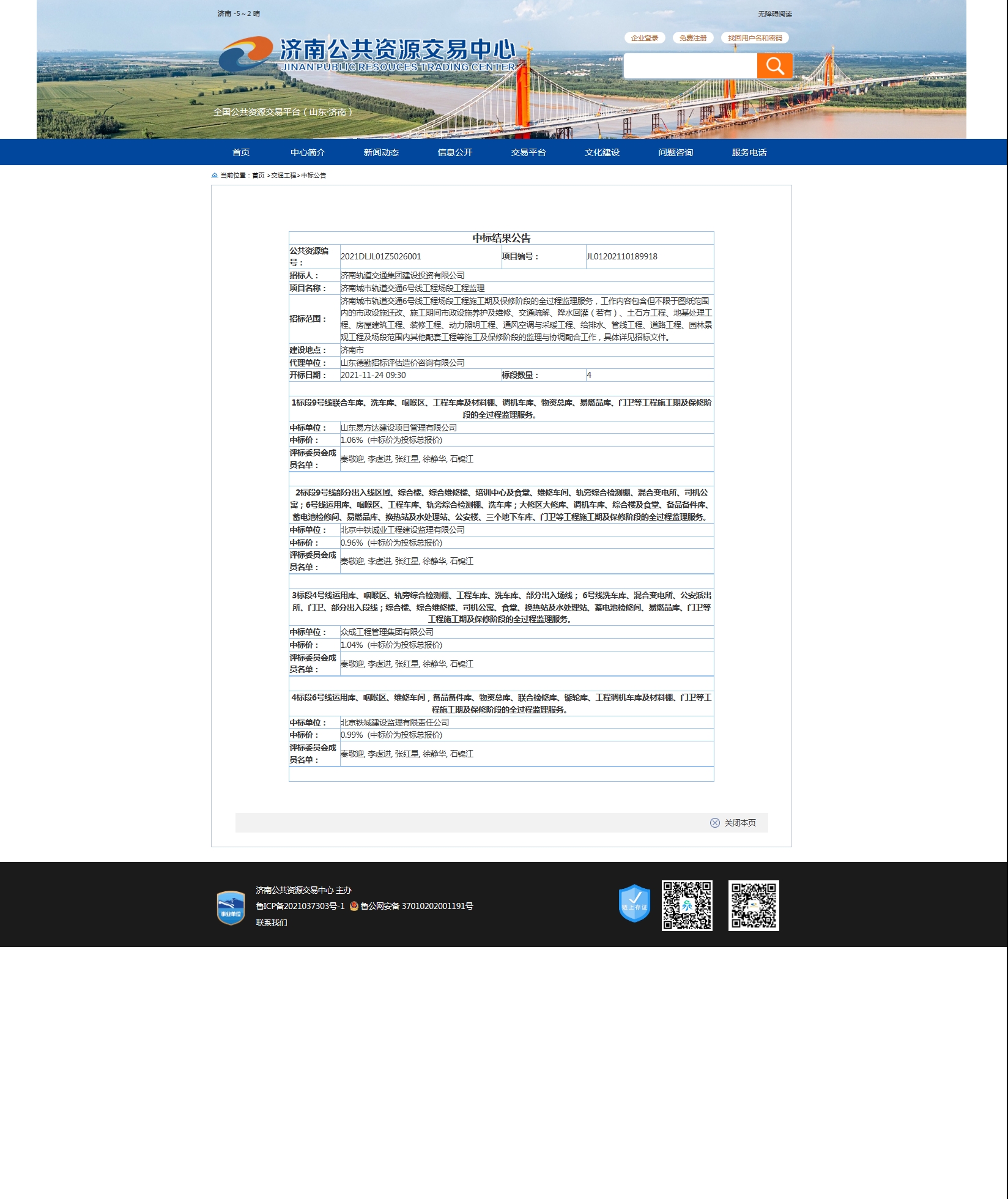 【招标投标信息】济南城市轨道交通6号线工程场段工程监理招标投标信息 发布日期:2021-10-18 10:45 信息来源:济南市政府门户网站 浏览次数:次 字体:【 默认 大 超大 】 招标公告:中标结果公示: 【打印本页】 【关闭窗口】