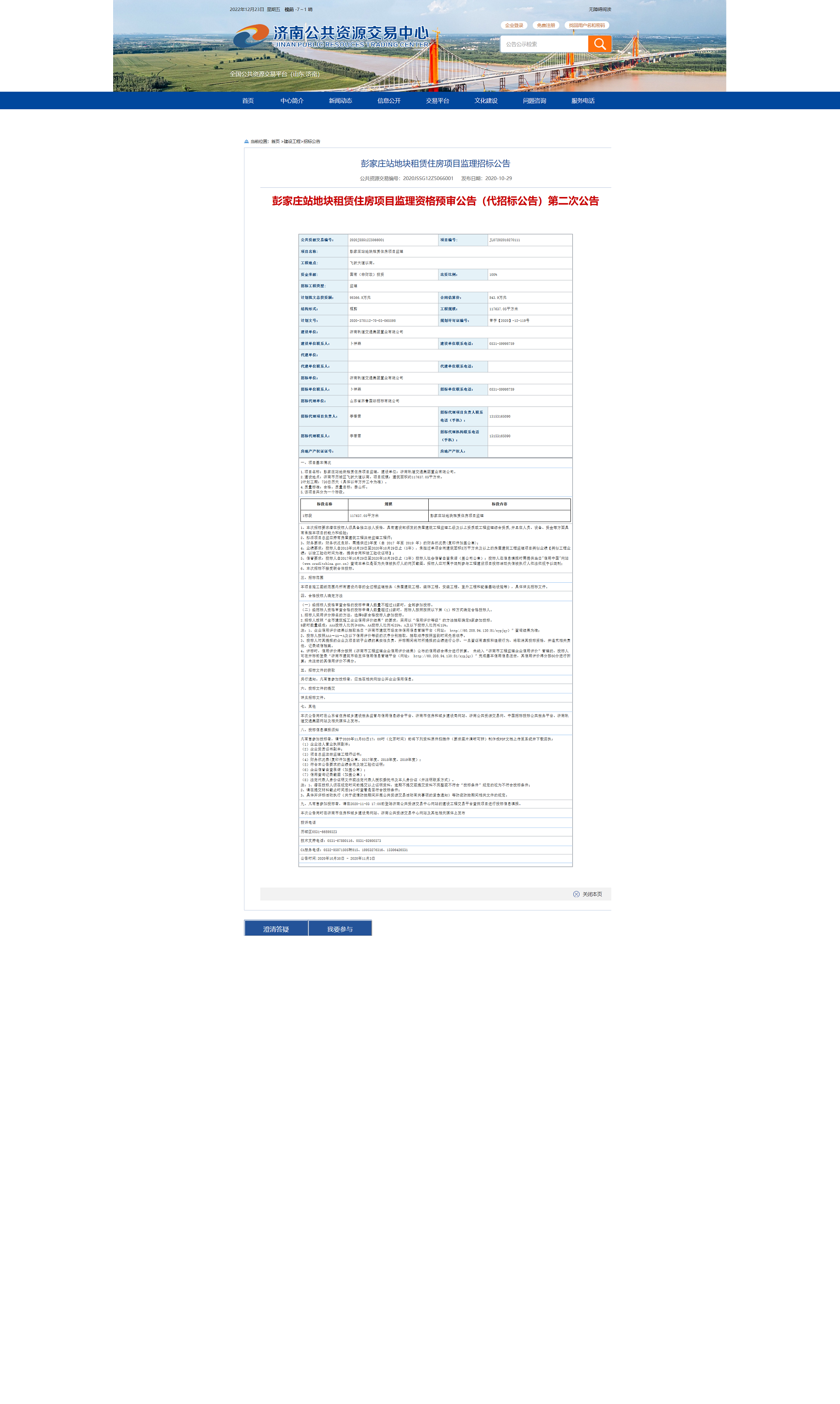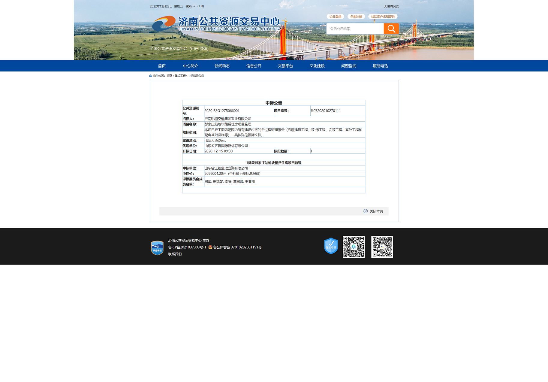 【招标投标信息】彭家庄站地块租赁住房项目监理招标投标信息 发布日期:2022-09-26 14:29 信息来源:济南市政府门户网站 浏览次数:次 字体:【 默认 大 超大 】 招标公告:中标结果公示: 【打印本页】 【关闭窗口】