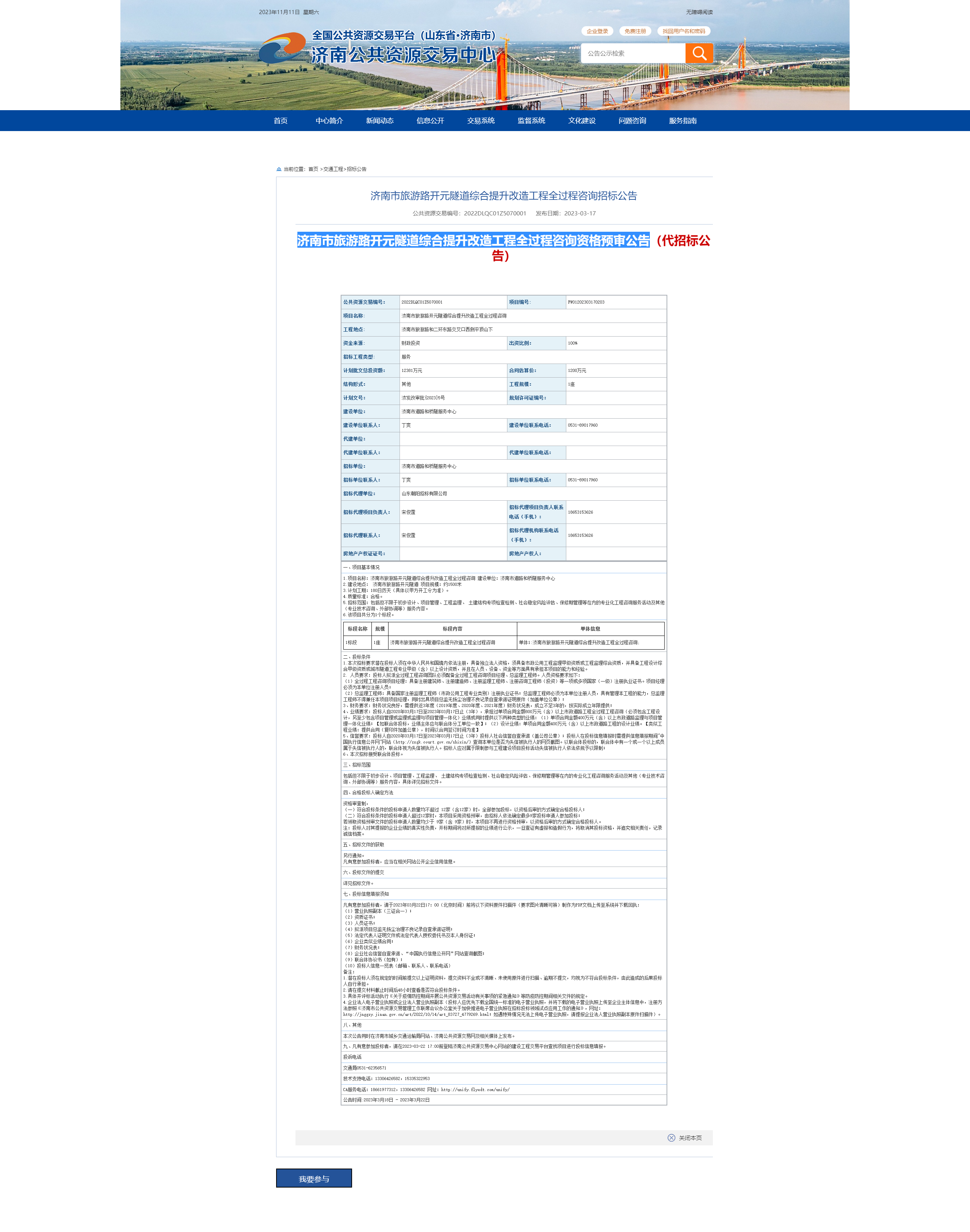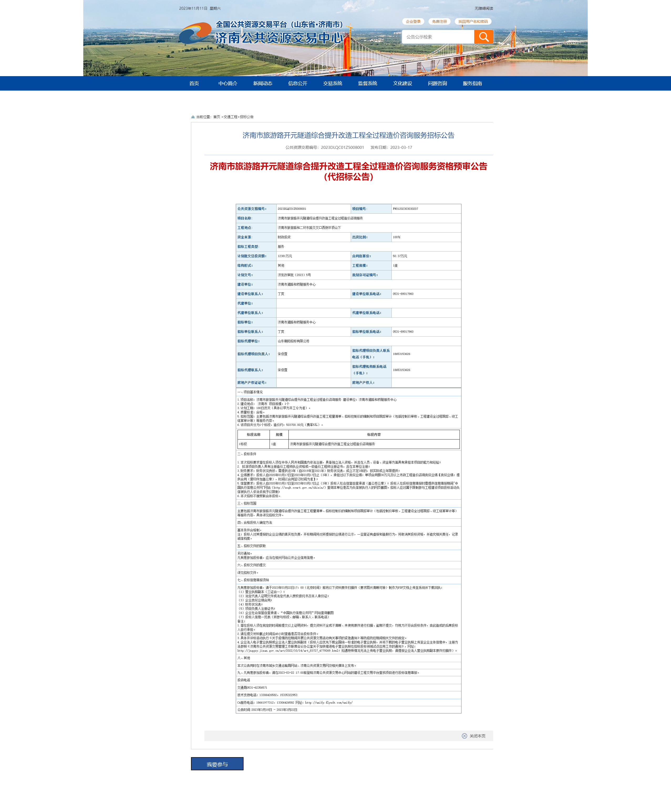 (1)济南市旅游路开元隧道综合提升改造工程全过程造价咨询服务资格预审公告(代招标公告)