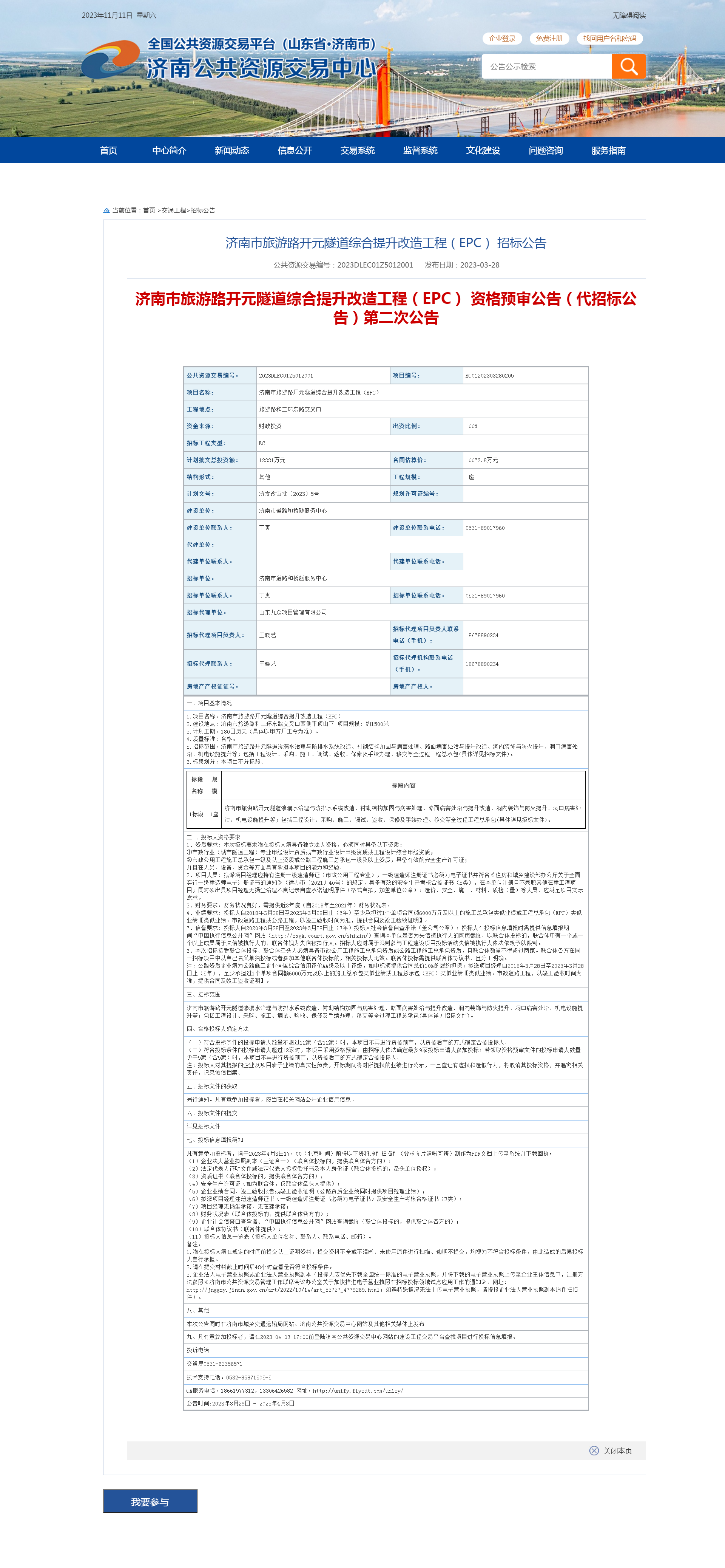 (1)济南市旅游路开元隧道综合提升改造工程(EPC) 资格预审公告(代招标公告)第二次公告