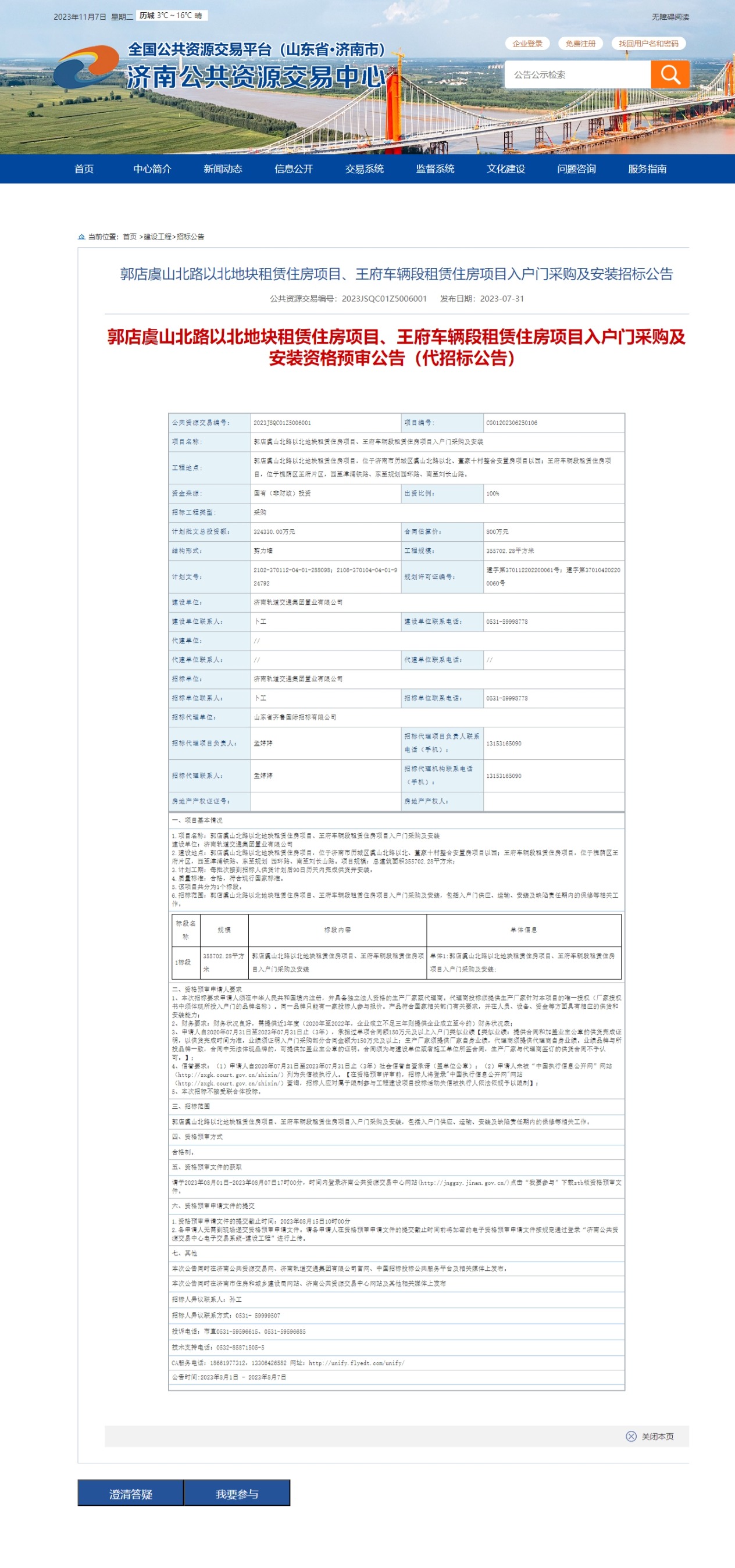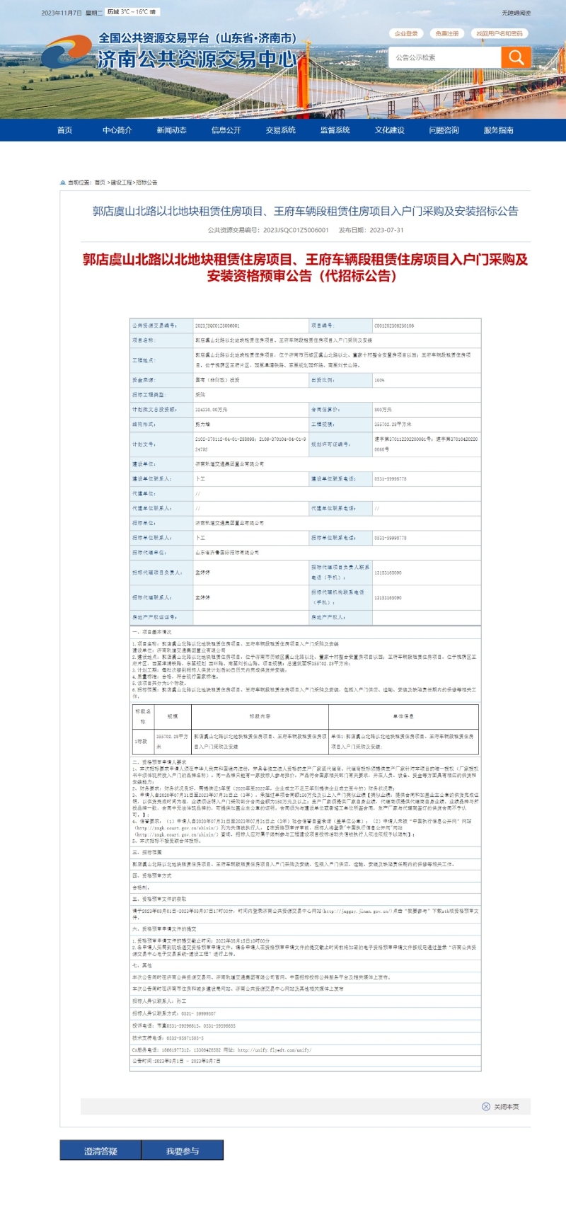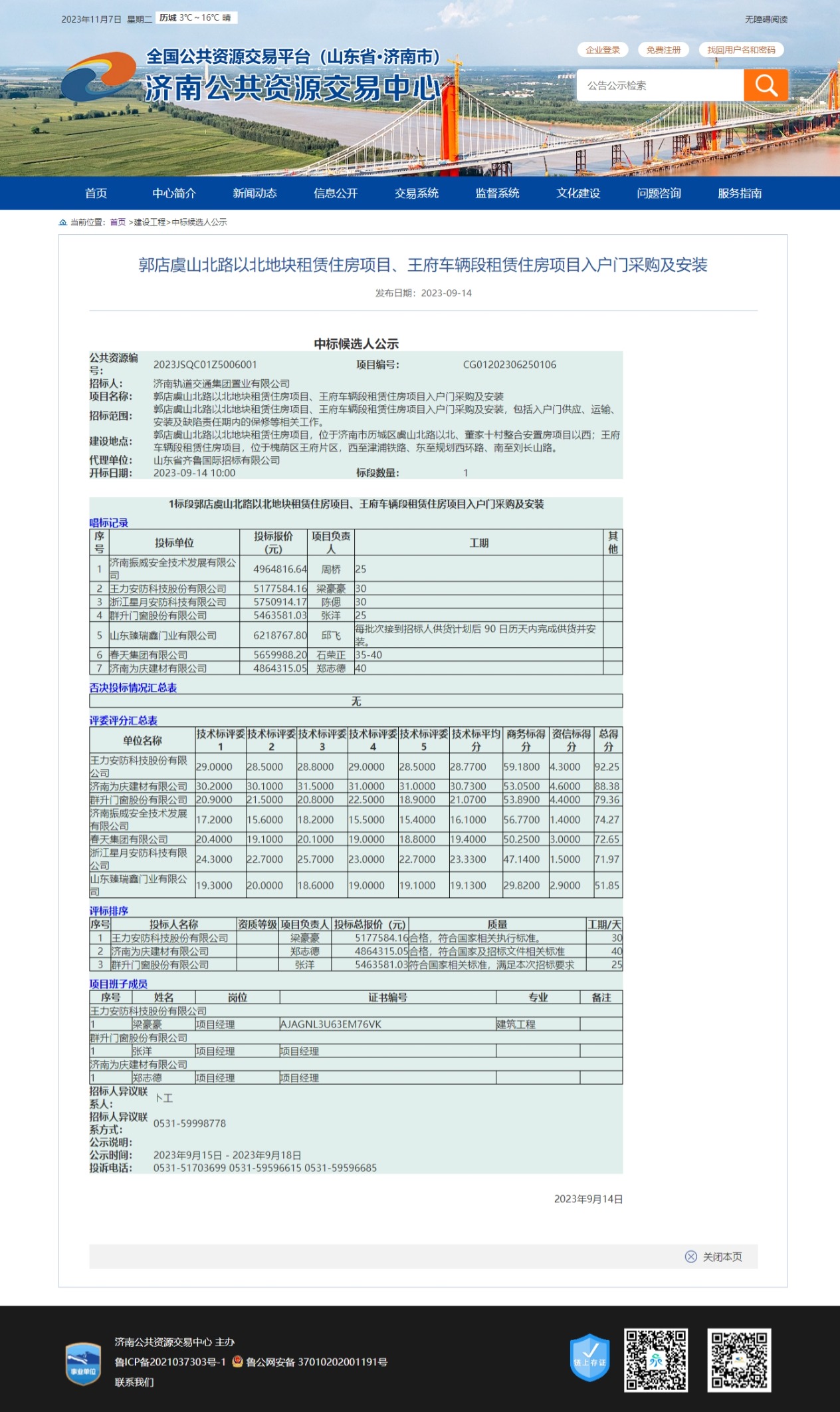 【招标投标信息】王府车辆段租赁住房项目招标投标信息(入户门) 发布日期:2023-12-01 16:50 信息来源:济南市人民政府办公厅 浏览次数:次 字体:【 默认 大 超大 】 【打印本页】 【关闭窗口】