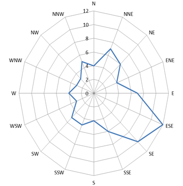 从莱芜国家基本气象站所处位置分析,观测场位于莱芜区城区东北部,由莱芜风向玫瑰图看出,最多风向为东东南(ESE),为保证气象探测资料的准确性和代表性,其周边障碍物必须符合气象探测环境保护标准。
