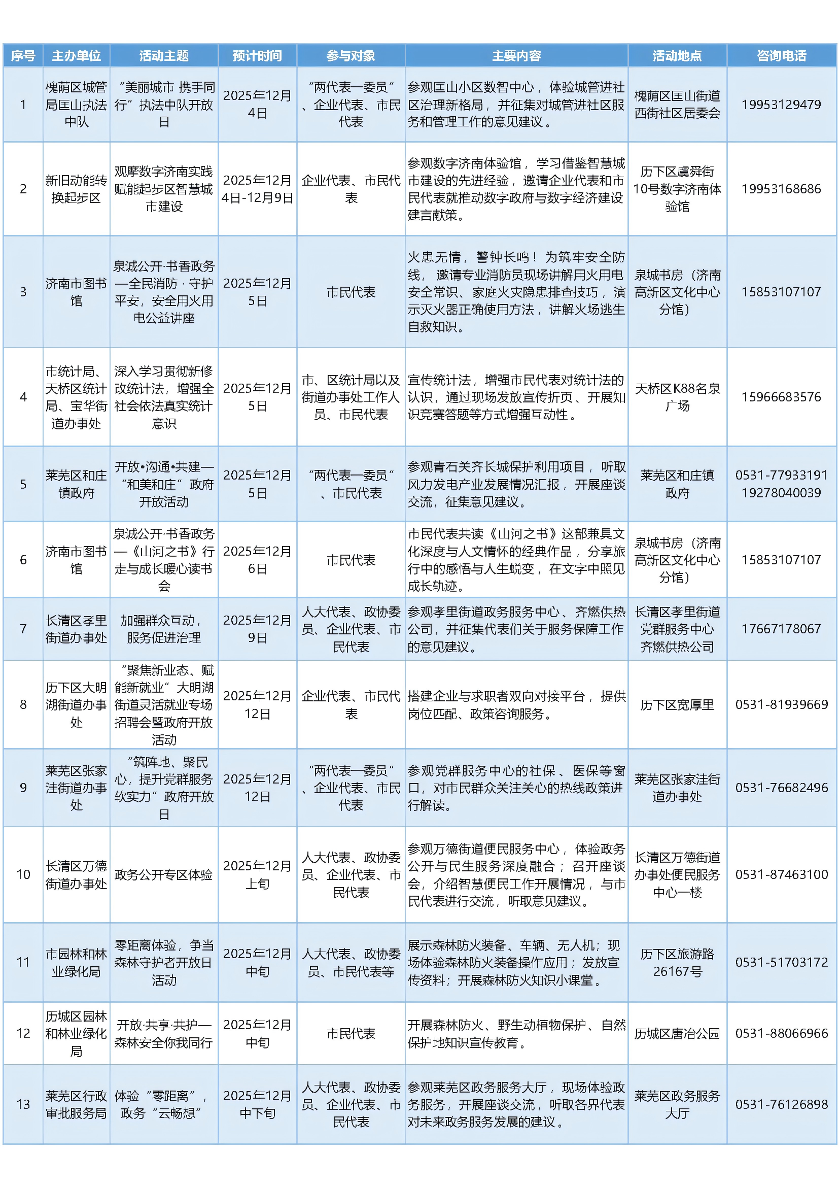 2025年12月济南市政府开放活动预告 发布日期:2025-12-02 17:50 信息来源:爱济南新闻客户端 浏览次数:次 字体:【 默认 大 超大 】 济南市2025年12月将举办“泉诚公开 政府开放”系列活动,涵盖城管执法、智慧城市建设、消防安全、统计法宣传、就业招聘、政务服务、森林安全等领域,欢迎您来参加。 【打印本页】 【关闭窗口】