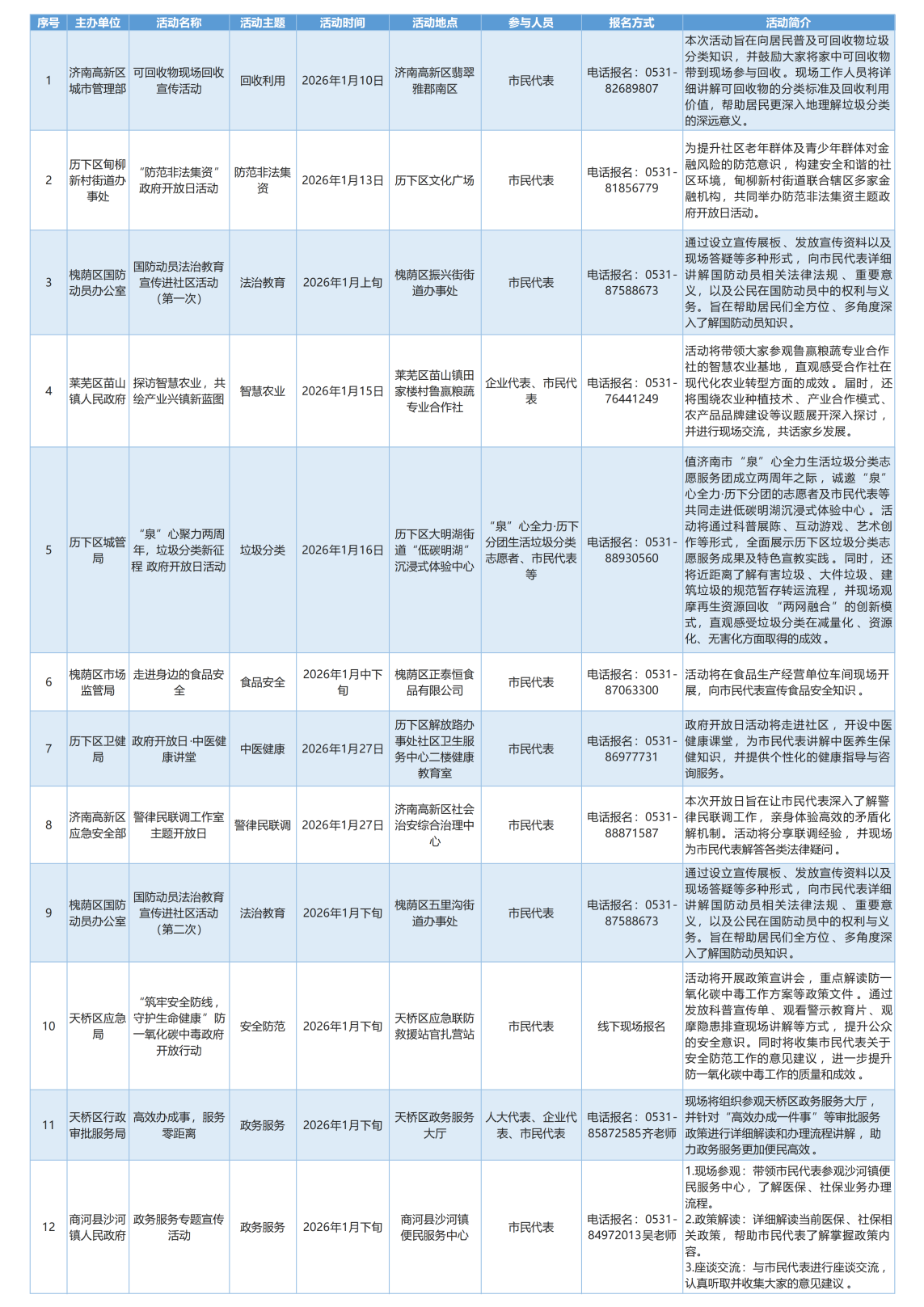 2026年1月济南市政府开放活动预告 发布日期:2025-12-30 17:59 信息来源:爱济南新闻客户端 浏览次数:次 字体:【 默认 大 超大 】 济南市2026年1月将举办“泉诚公开 政府开放”系列活动,涵盖回收利用、智慧农业、垃圾分类、食品安全、中医健康、政务服务等领域,欢迎您来参加。 【打印本页】 【关闭窗口】