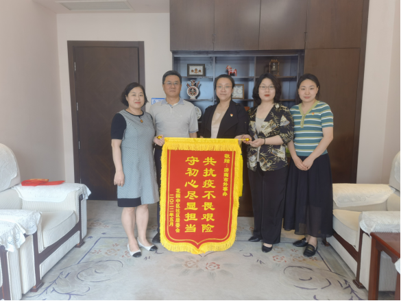 近日,历城区唐冶街道办主任付常勇和副书记王俊杰,洪家楼街道花园中区书记姬青和副书记李金凤,分别将写有“同舟共济抗疫情,众志成城显担当”、“共抗疫不畏艰险,守初心尽显担当”的锦旗送到济南市外办,对市外办党员干部参加社区疫情防控、支援一线抗疫工作表示衷心感谢。