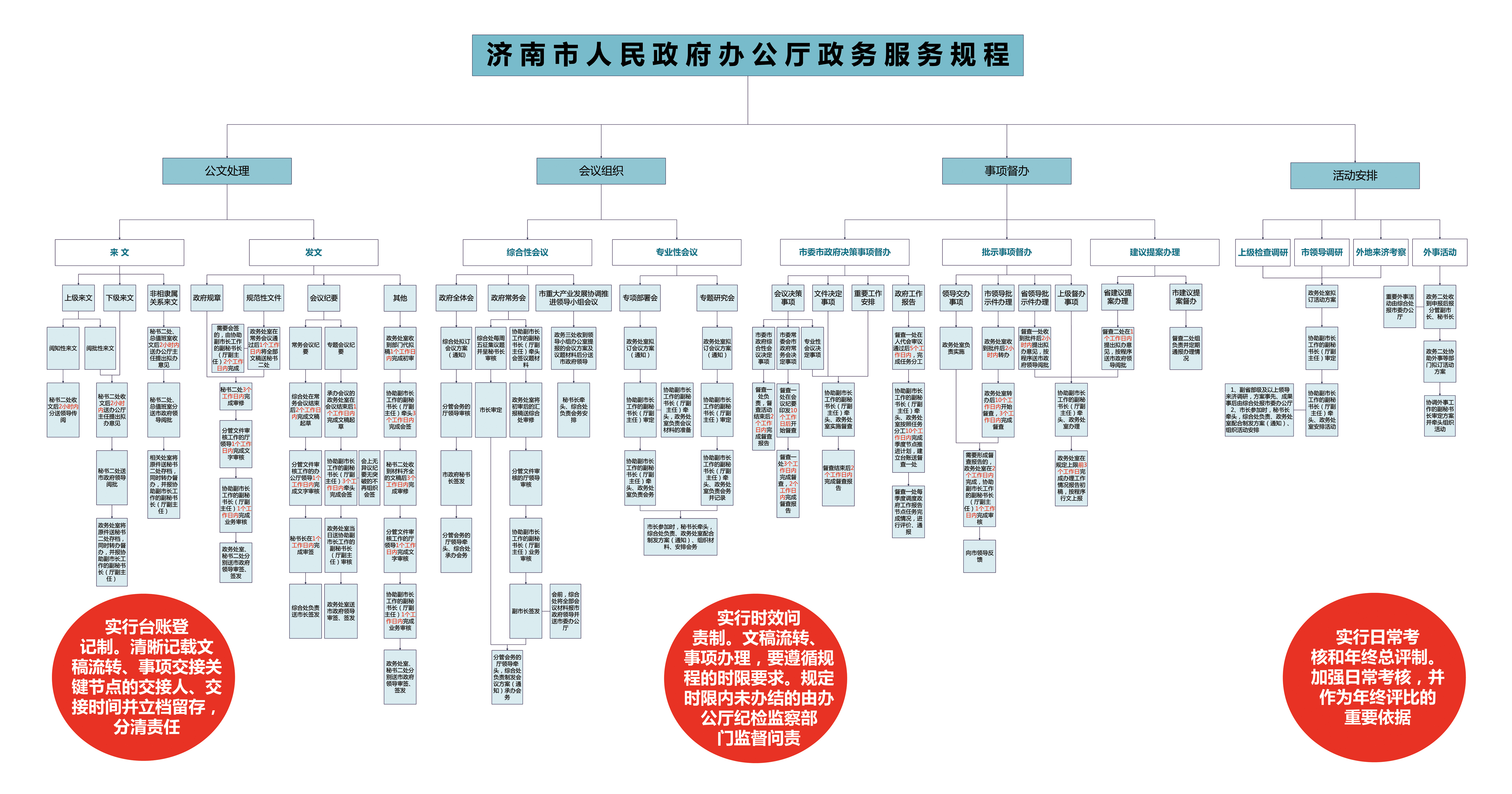 (一)规范公文处理。严格落实《党政机关公文处理工作条例》有关规定,由办公厅秘书二处一口受理各县(市)区政府、市政府各部门正式报送的公文,规范收文办理各项环节,杜绝公文越级报领导签批。同时,强化政务处室转办、催办、督办领导批件职能,减少环节,提高公文运转效率。