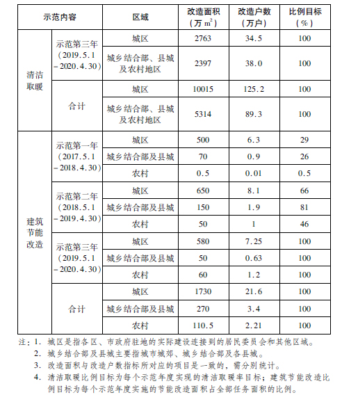 (二)试点目标及路径。2017—2020年,我市清洁取暖改造面积为1.53亿平方米,其中城区改造面积10015万平方米,实现100%清洁取暖;城乡结合部及县城改造面积2314万平方米,实现100%清洁能源和新能源取暖;农村地区改造面积3000万平方米,清洁取暖率达到100%。全市既有建筑节能改造2110.5万平方米,完成“十三五”目标任务。