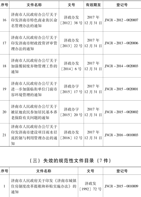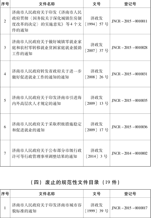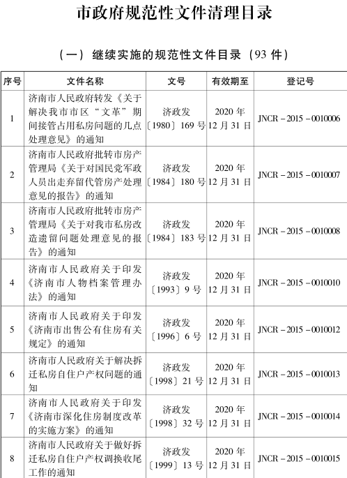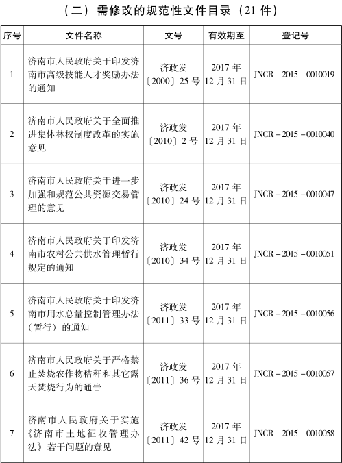 各县区人民政府,市政府各部门: 为深入推进依法行政,加快法治政府建设,根据省关于开展政府规章和规范性文件清理工作的通知要求,我市对2017年7月1日前公布实施的市政府规范性文件进行了清理,确定继续实施的规范性文件93件、需修改的21件、失效的7件、废止的19件(目录详见附件)。 本决定自公布之日起生效。