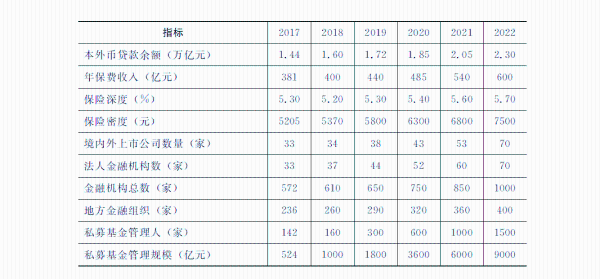 具体目标。构建与全国产业金融中心地位相匹配的金融机构体系,到2022年,引进10家以上具有国内外影响力的大型金融机构总部、区域总部或功能总部,在引进国际金融机构区域总部、国际金融组织分支机构等领域取得重大突破。