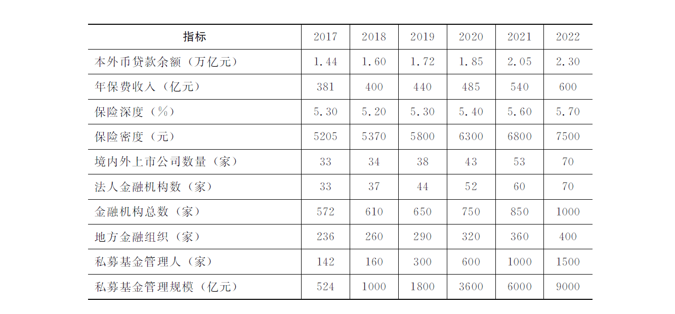 ——支柱地位突出。到2022年全市金融产业增加值达到1250亿元,占GDP比重达到12%左右;金融业税收达到250亿元,占税收比重达到13%左右,社会贡献度进一步提升;本外币存款余额达到2.5万亿元,本外币贷款余额达到2.3万亿元;全年保费收入达到600亿元,保险深度达到5.7%左右,保险密度达到7500元/人;金融产业主要指标在全省的首位度大幅提升。