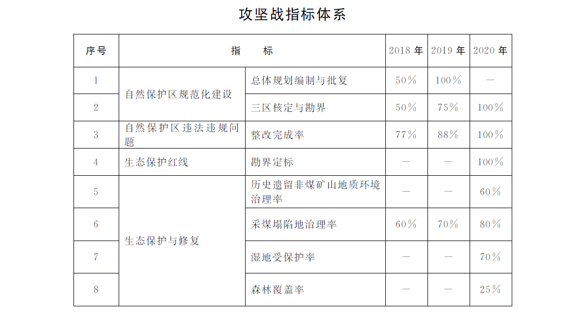 (二)主要工作目标。自然保护区达到规范化建设水平,突出问题得到有效整治。持续开展自然保护区监督检查专项行动,对突出问题进行综合整治。到2020年,突出问题得到有效解决,坚决杜绝新增问题,历史遗留问题得到有效管控。
