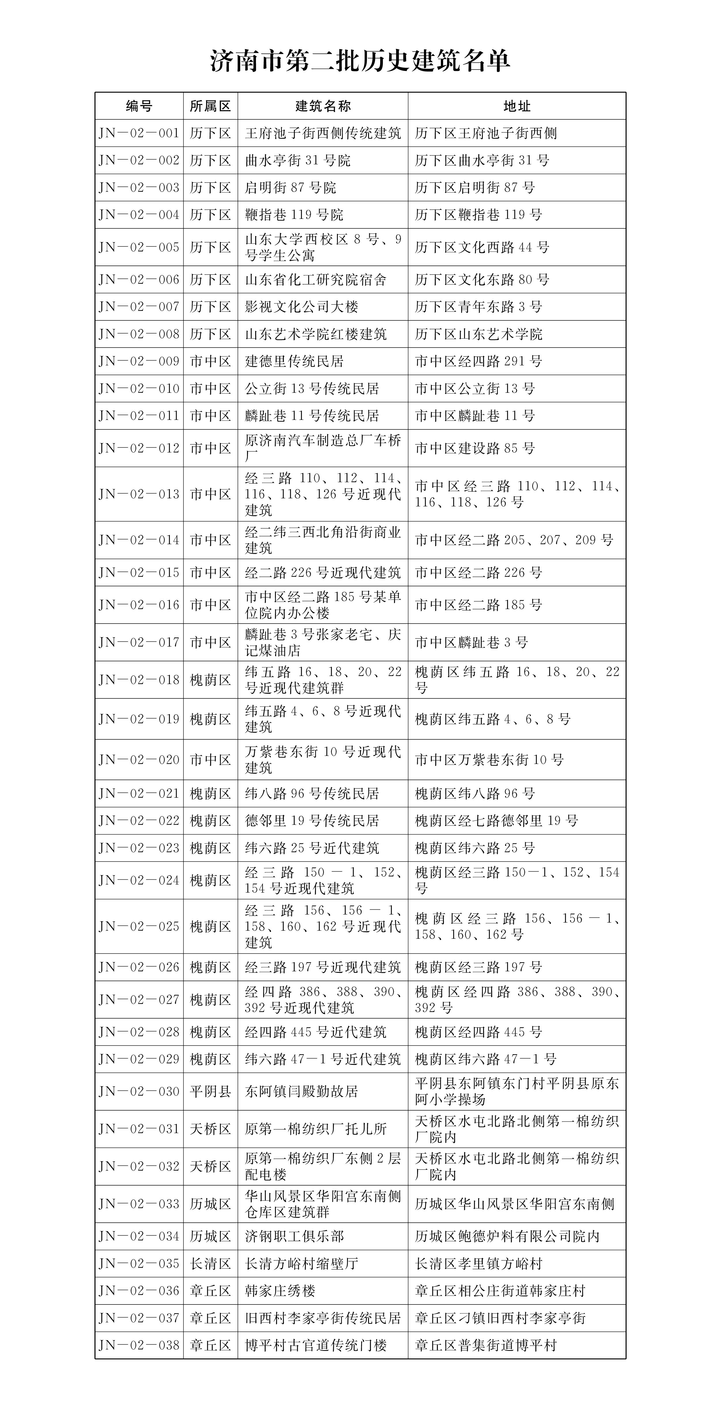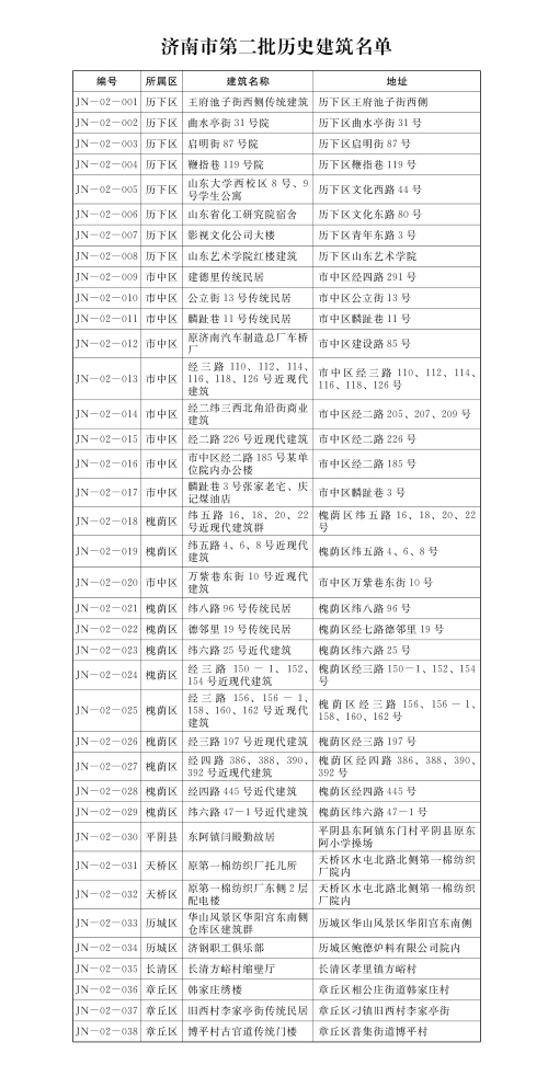 根据《历史文化名城名镇名村保护条例》(国务院令第524号)规定和上级关于加强历史建筑保护的部署要求,我市确定王府池子街西侧传统建筑等38处建筑为济南市第二批历史建筑,现予公布,《保护图则》由市自然资源和规划局另行公布。