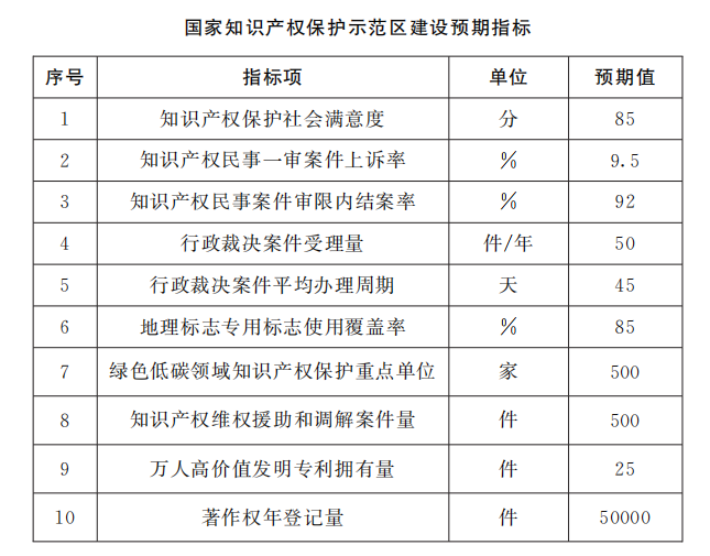 力争到建设期满,高标准完成国家知识产权保护示范区建设各项任务,全市知识产权保护工作科学稳健,知识产权法治化水平显著提高,全链条保护体系更加完善,执法监管能力大幅提升,知识产权转化运用能力不断增强,对外交流合作持续深化,全社会尊重和保护知识产权的浓厚氛围加速形成,支撑强省会建设和济南都市圈高质量发展的作用更加突出,奋力打造立足济南、面向山东、辐射黄河流域的全国知识产权保护标杆城市。