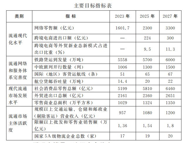 到2027年,现代流通战略支点城市建设取得重大进展,基本形成系统完备、创新引领、协同联动、立体高效的现代流通体系。流通领域数字化智能化进程加快推进,网络零售额达到3300亿元,跨境电商进出口额达到300亿元,跨境电商等外贸新业态新模式占进出口比重达到11.3%。流通网络更加畅通,流通能力持续提升,全市铁路货运到发量达到6000万吨,中欧班列开行数量达到1500列,国际(地区)客货运航线达到67条,航空货邮吞吐量达到22万吨。流通市场运行更加高效,社会消费品零售总额达到6460亿元,外贸进出口总额达到2651亿元,零售商业总面积达到1350万平方米。流通产业发展水平显著提升,规模以上交通运输、仓储和邮政业(剔除客运)营业收入达到1200亿元,限额以上批发和零售业销售额达到1.8万亿元,国家5A级物流企业总数达到20家。