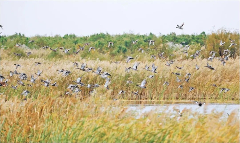 10月17日,野生鸟类在东营市黄河三角洲国家级自然保护区湿地内飞翔。(新华社)