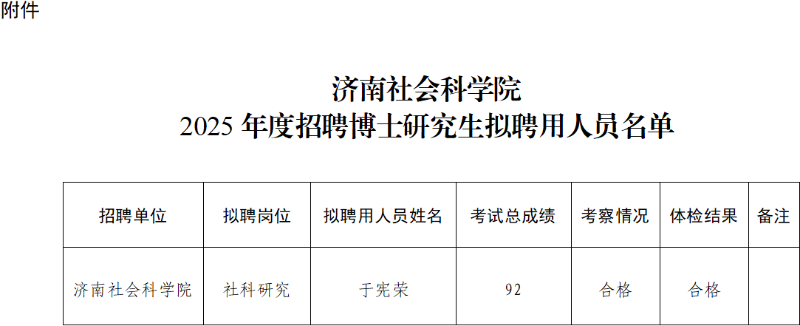 按照《济南社会科学院2025年度博士研究生招聘简章》有关要求,经过报名、单位初审、现场资格审核、面试、考察体检等程序,确定于宪荣为济南社会科学院社科研究岗位拟聘用人员,现予以公示。